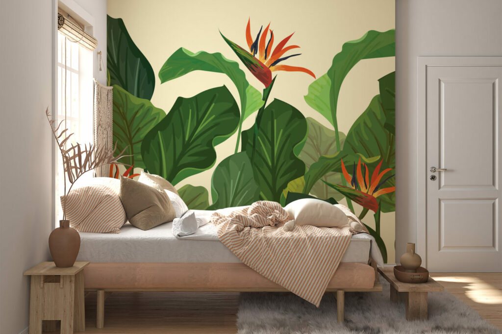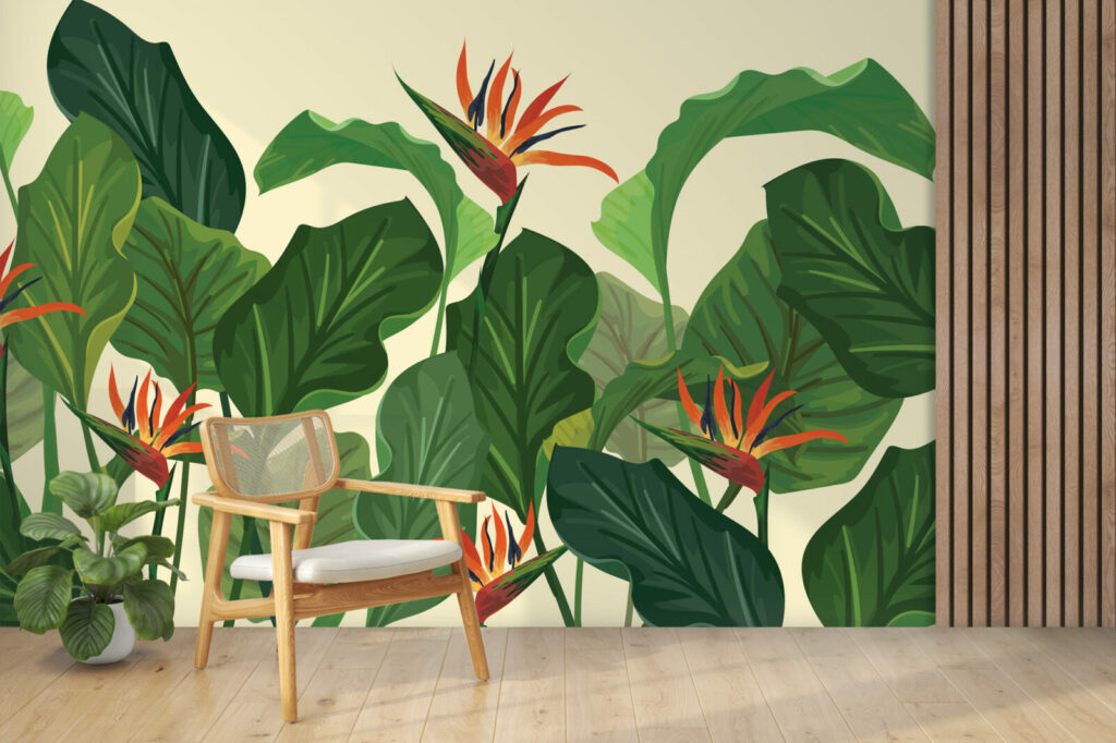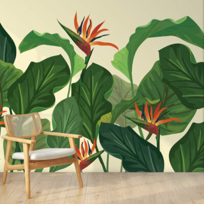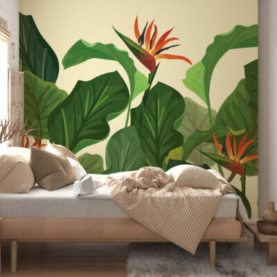 Sur un fond beige sable au motif feuillage, fougères et feuilles de bananiers côtoient les fleurs exotiques. Ce panoramique tropical chic insuffle une ambiance chaleureuse et conviviale, parfaite pour un salon à la déco naturelle, une chambre, un studio, une salle de restaurant ou de sport…