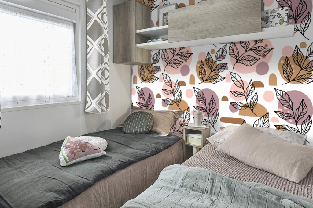 Transformez ce revêtement mural orné de feuilles chatoyantes en votre nouvel élément décoratif favori. Les nuances de rose, marron, de prune de ces feuillages font éclore votre mur d’une manière vibrante et colorée.