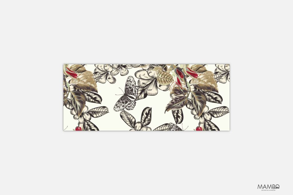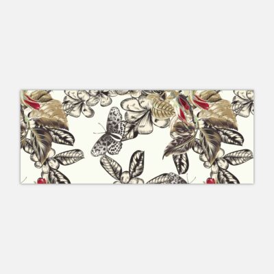 Ce décor raffiné met en scène des feuilles dessinées à la plume, rehaussées de touches rouge carmin. De gracieux papillons monochromes se posent ici et là sur un fond ivoire. L’ensemble évoque les planches naturalistes anciennes et s’intègre parfaitement dans un intérieur vintage, haussmannien ou contemporain avec des accents art déco. Il se marie particulièrement bien avec des murs clairs, des cadres dorés et des objets en laiton vieilli.