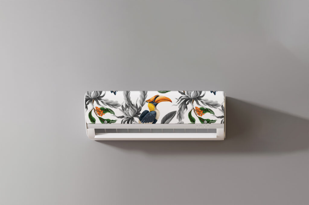 Ce sticker pour climatisation est idéal pour ceux qui souhaitent marier nature et élégance. Grâce à une impression haute définition sur vinyle fin, il restitue avec finesse chaque plume et chaque feuille, donnant un effet presque peint à la main. L’harmonie des couleurs – vert foncé, noir, orange et blanc cassé – crée un contraste raffiné, parfait dans un salon lumineux, une pièce tropicale ou même une chambre.