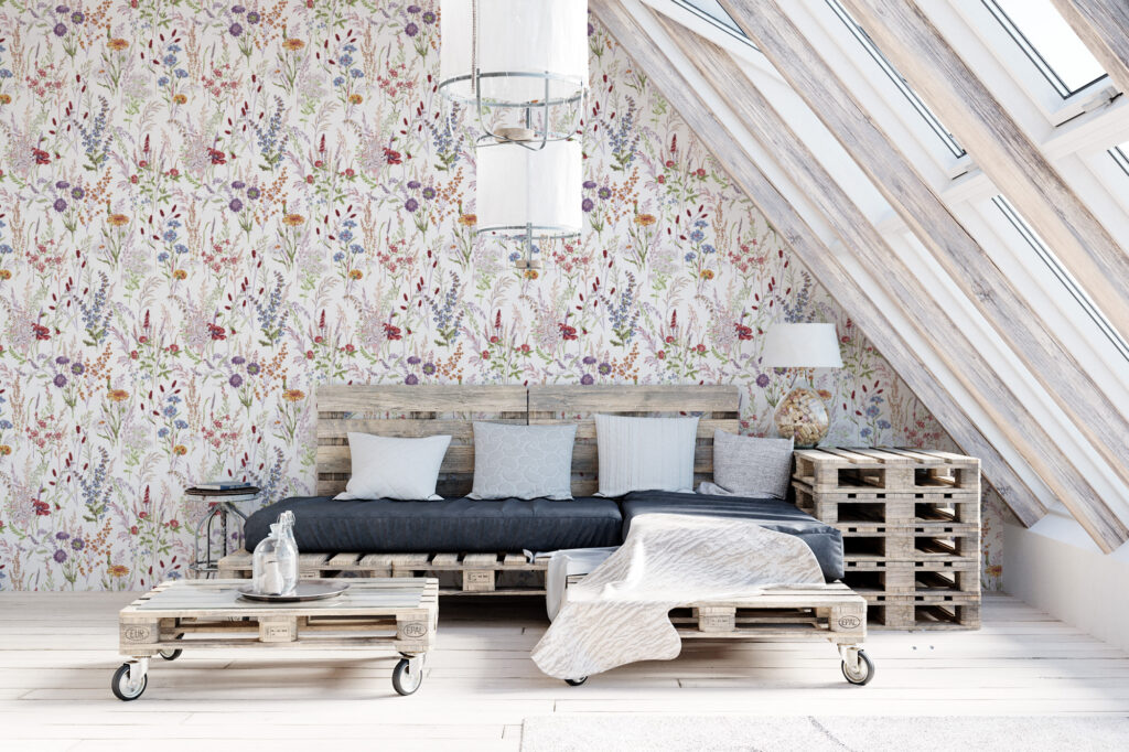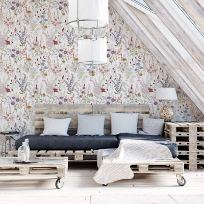Tout d’abord, le design met en scène une multitude de fleurs sauvages finement illustrées. Les tiges élancées, les feuillages délicats et les petites fleurs colorées s’élèvent avec grâce sur un fond clair. Chaque élément semble dessiné avec précision, comme cueilli dans une prairie naturelle. Ainsi, le papier peint tendance botanique crée un décor vivant, subtil et équilibré.