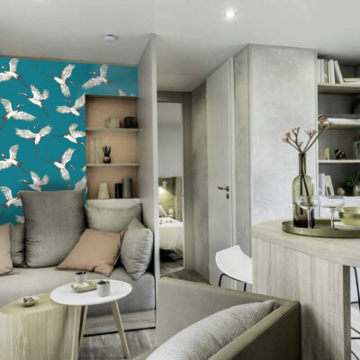 papier peint pré encollé grues japonisantes haut de gamme mobil home- turquoise
