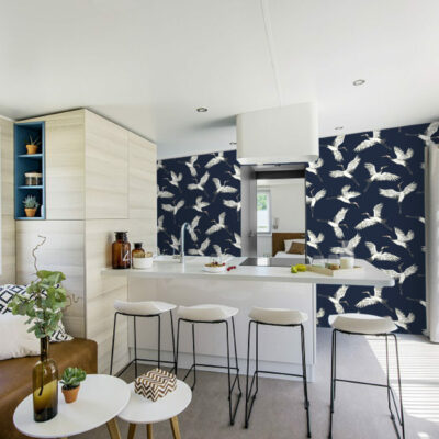 papier peint pré encollé grues japonisantes haut de gamme mobil home- bleu