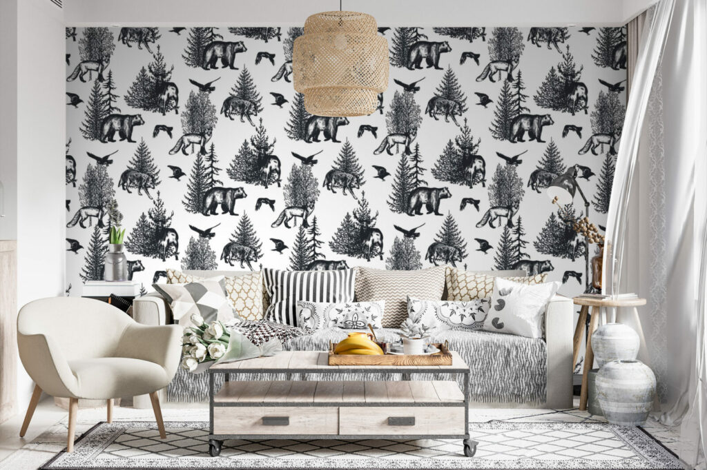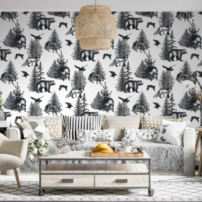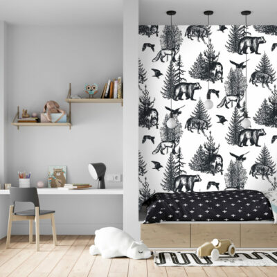 Créez une ambiance unique et apaisante dans vos intérieurs avec le papier peint Forest Animals. Ce modèle présente un motif détaillé et soigneusement dessiné, mettant en scène des animaux majestueux tels que des ours, des loups, des cerfs et des aigles, entourés de sapins imposants. Avec sa palette monochrome raffinée, ce papier peint est capable d’envelopper n’importe quelle pièce d’une élégance naturelle, tout en offrant une touche moderne.