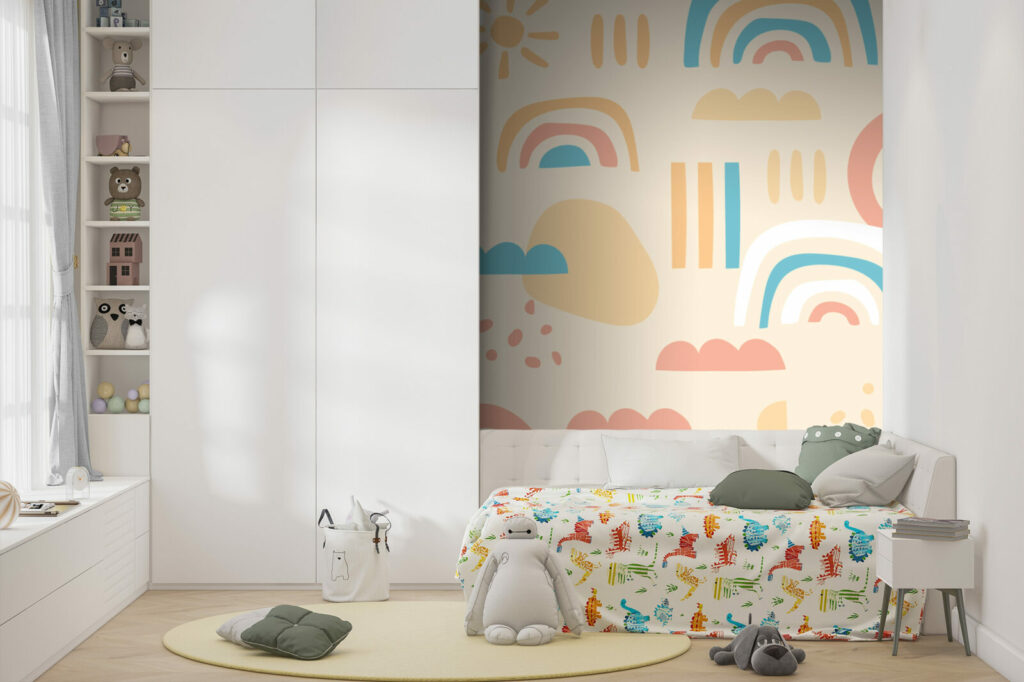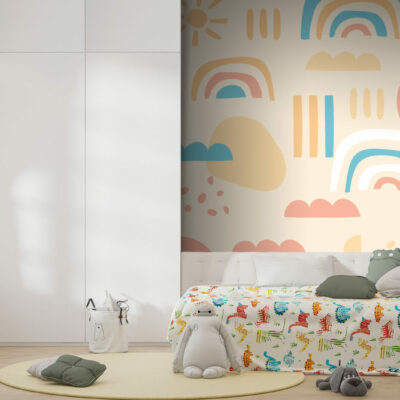 Le papier peint Little Boho se distingue par ses motifs doux et bohèmes, idéal pour créer une ambiance chaleureuse et apaisante dans n’importe quel intérieur. Ce design présente des formes abstraites, des arcs-en-ciel stylisés et des soleils en tons pastel, combinant harmonieusement des nuances de bleu clair, de rose, de beige et de jaune. Le fond crème ajoute une touche de légèreté et permet aux motifs de ressortir.