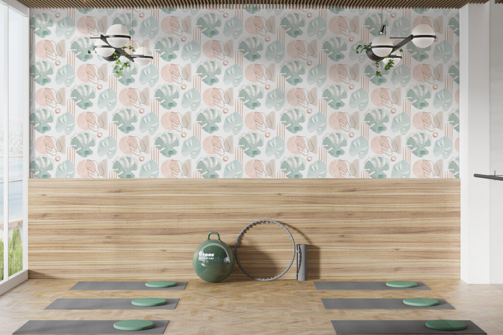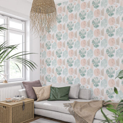 Les teintes dominantes — vert sauge, beige nude et rose poudré — créent une ambiance apaisante et chaleureuse. Le motif alterne feuilles de monstera, visages esquissés, aplats colorés et lignes verticales minimalistes. Ce papier peint aquarelle végétal évoque les tendances slow déco et art line, parfait pour celles et ceux qui recherchent une décoration murale inspirante mais non intrusive.