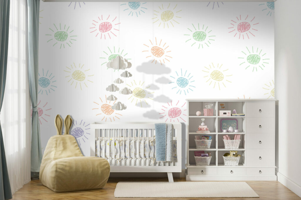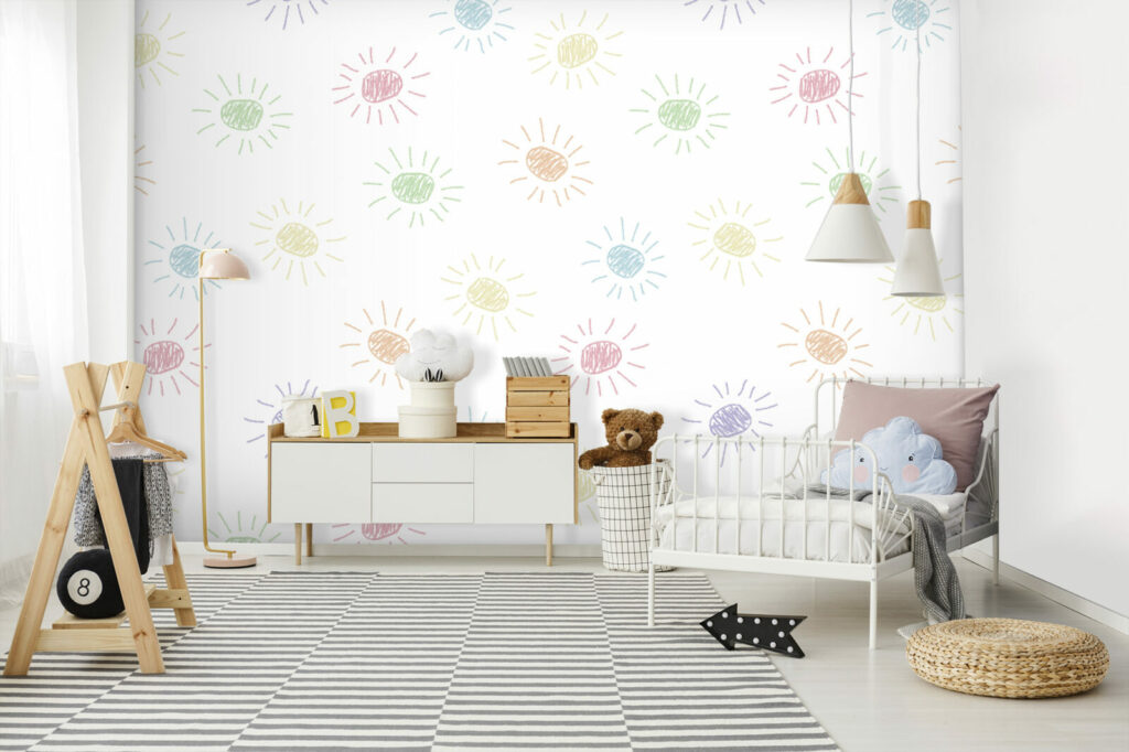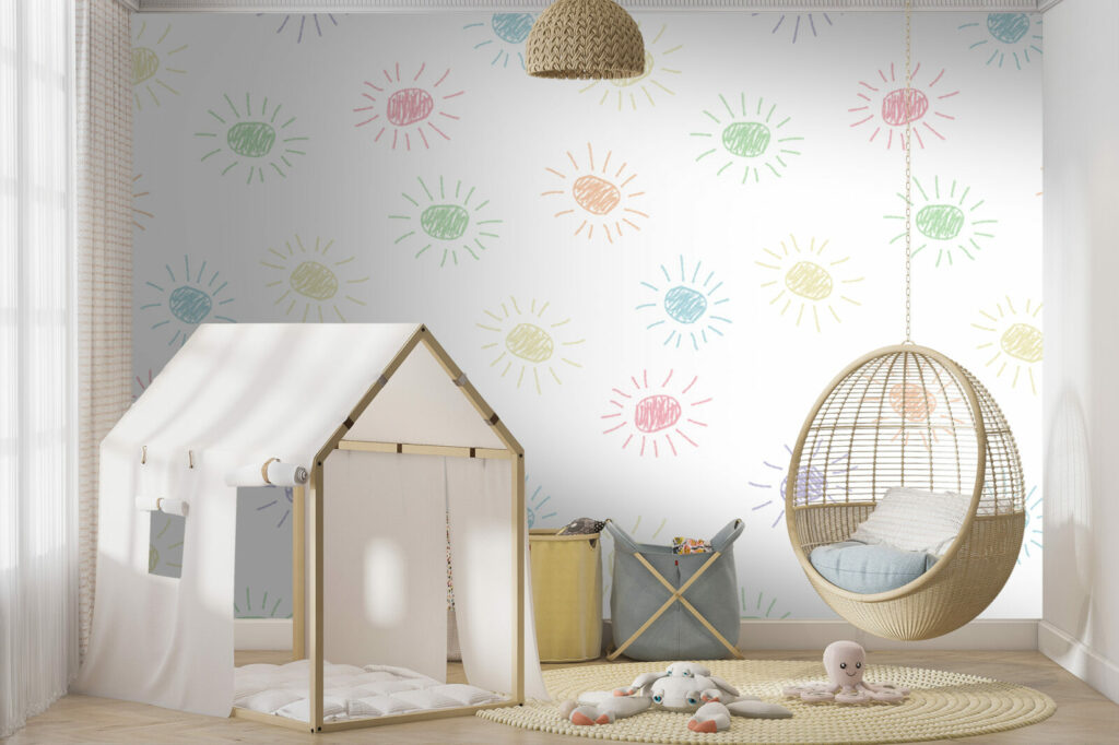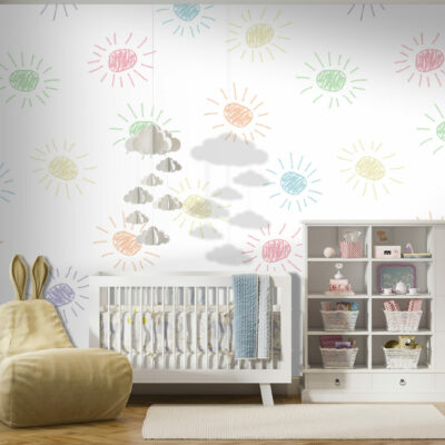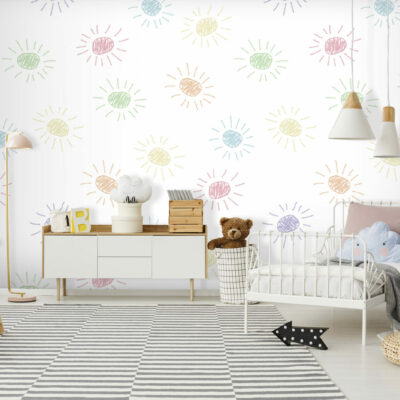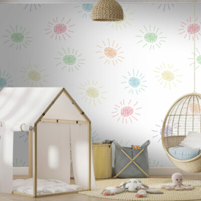 Offrez à la chambre de votre enfant une ambiance joyeuse et pleine de vie avec notre papier peint aux motifs de soleils multicolores dessinés à la main. Chaque soleil, réalisé dans un style artistique évoquant les crayons de couleur, apporte une touche d’originalité et de gaieté. Sur un fond blanc pur, ces éclats de couleurs vives – rouge, bleu, jaune, vert, et bien d’autres – créent une atmosphère lumineuse et ludique, parfaite pour stimuler l’imagination des plus petits.
