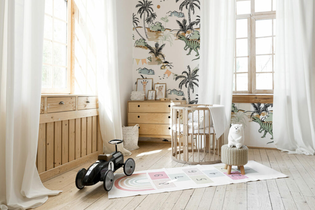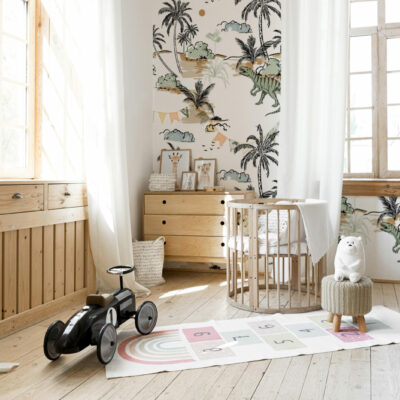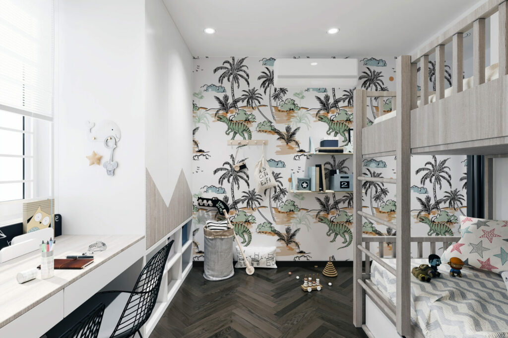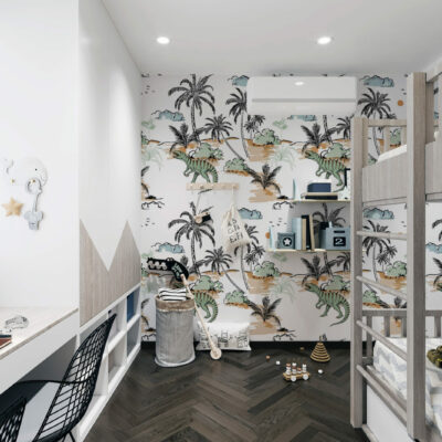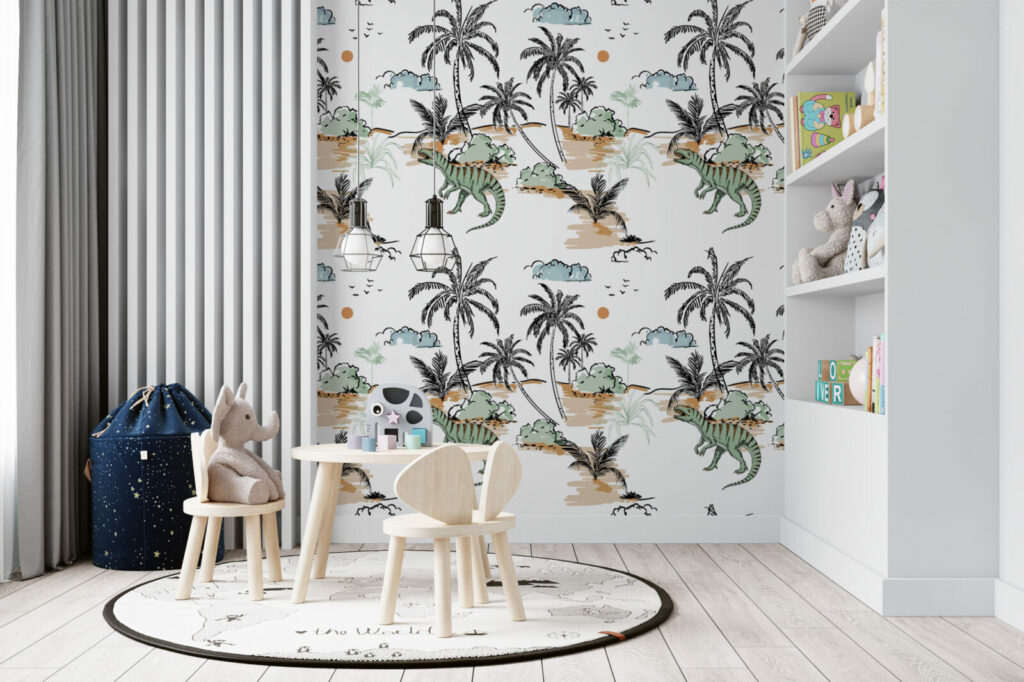 Faites rugir l’imaginaire avec ce papier peint dinosaures enfant, un décor ludique et poétique pensé pour transformer la chambre en véritable île préhistorique. Entre palmiers graphiques, dinosaures bienveillants et teintes douces, ce revêtement mural invite à l’aventure tout en douceur. Idéal pour créer un univers stimulant et rassurant, il s’adapte autant à une décoration chambre garçon qu’à un espace mixte empreint de fantaisie.