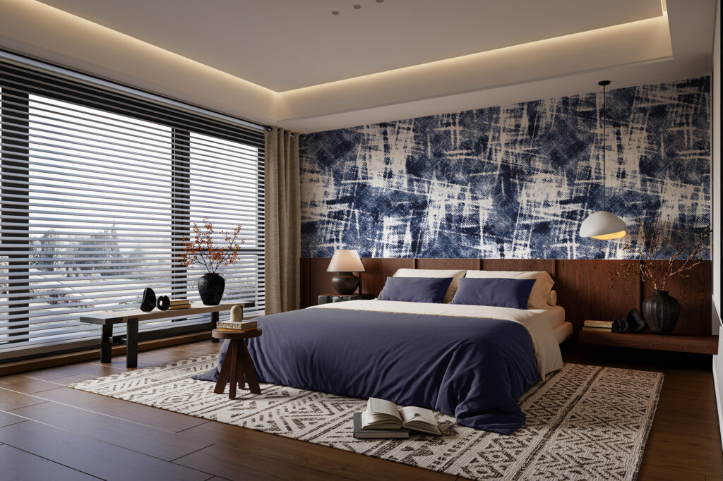 Par ailleurs, Indigo Trace s’intègre facilement dans de nombreux univers décoratifs. Dans un salon contemporain, il devient un mur d’accent audacieux et structurant. Dans une chambre, il apporte une touche urbaine et cosy à la fois. Il trouve également sa place dans un bureau, un loft ou un espace professionnel, où son esthétique textile renforce une ambiance créative et design.