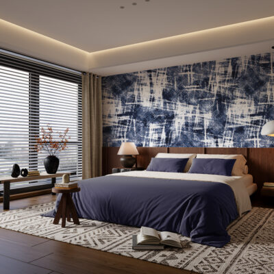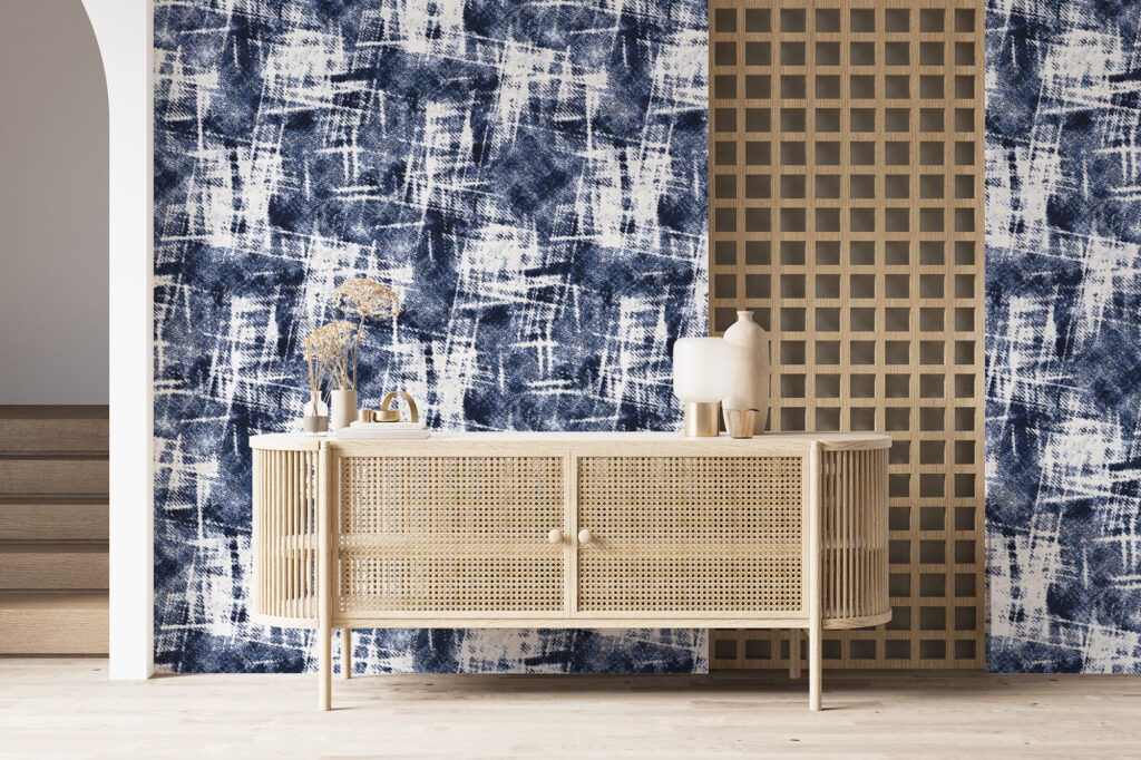 Ensuite, la palette chromatique renforce cette impression textile. Les nuances d’indigo profond, de bleu délavé et de blanc cassé s’entremêlent avec subtilité. Ces contrastes maîtrisés apportent de la profondeur au mur, tout en conservant une grande cohérence visuelle. Le rendu reste graphique, moderne et parfaitement équilibré.