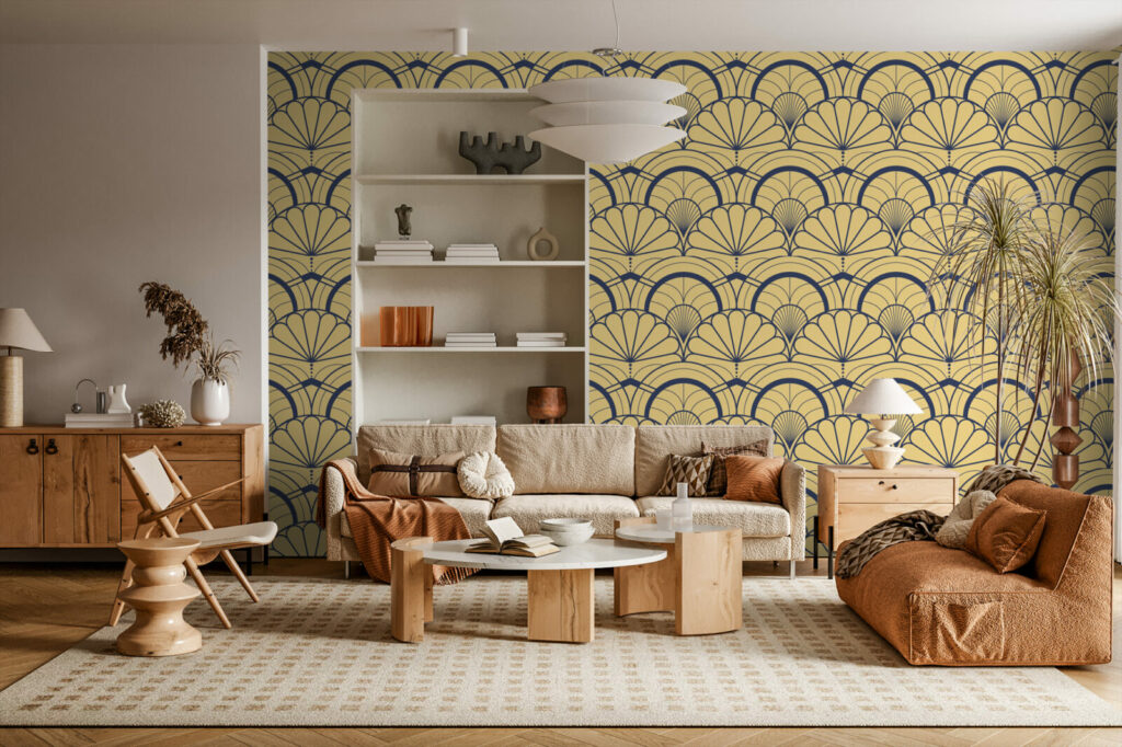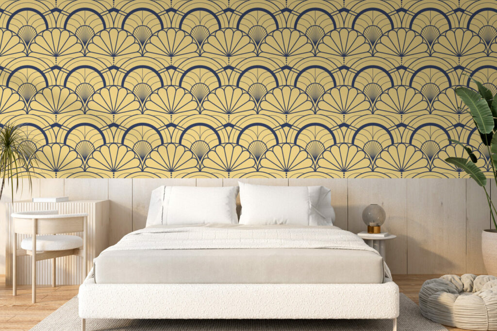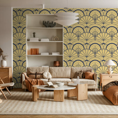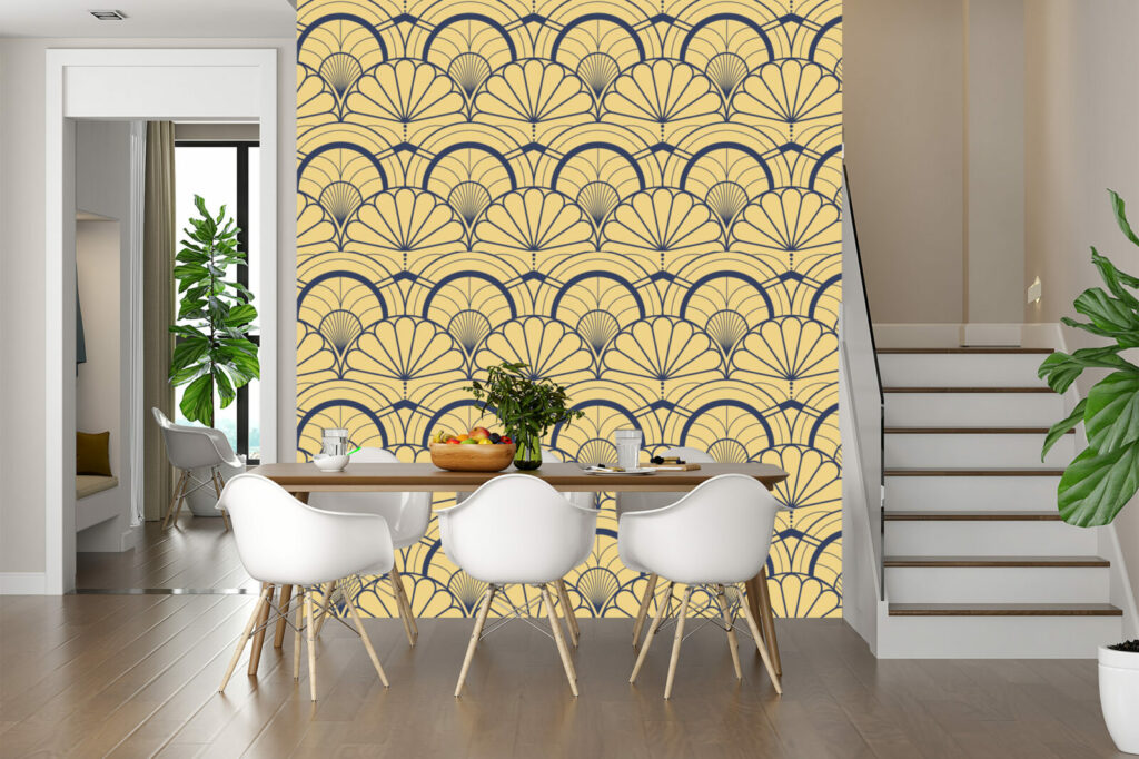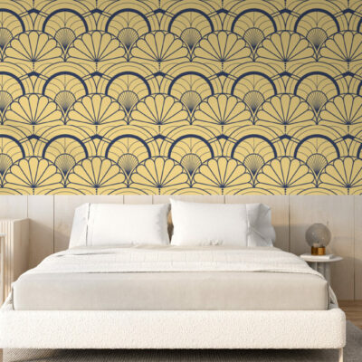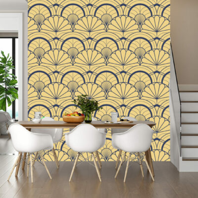 Cet élégant papier peint Eventails chics dans les tons jaunes et ocre reprend le motif éventail, très populaire dans les années 20. Répétés à l’infini, les éventails stylisés en jaune forment un décor graphique dynamisant. Inspiré de l’art déco, ce papier peint jaune habille votre mur d’un imprimé graphique sobre et délicat.