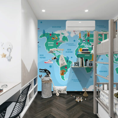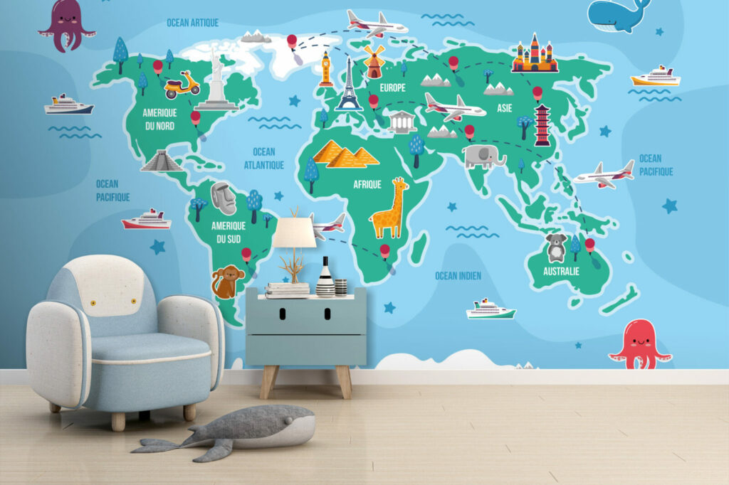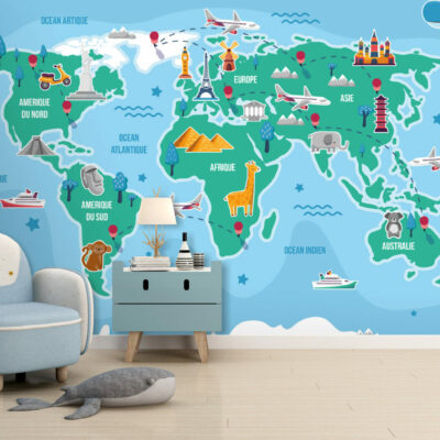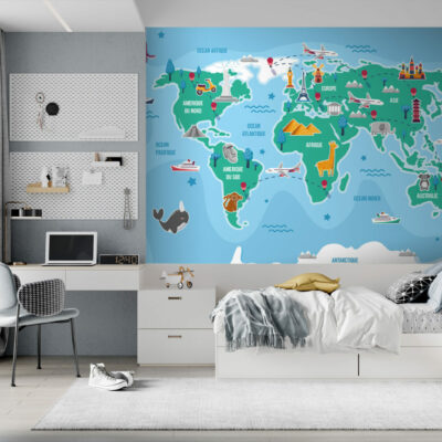 Créez une atmosphère heureuse et vivante dans la chambre de vos petits avec le Papier peint carte du monde enfant, avec des Animaux et monuments du monde. Le Papier peint carte du monde enfant, sur fond de bleu nuancé et continents verts, est peuplé par d’animaux sauvages : koalas, girafes, singes, baleines, éléphants, pieuvres ainsi que les principaux monuments : pyramides, tour Eiffel, big Ben, Statue de la liberté, et moyens de transport : bateaux, avions. Idéal pour la chambre des enfants ou la chambre bébé, ce modèle thème carte du monde ajoute une touche de gaieté aux espaces dédié aux petits tout en s’adaptant à tout mobilier. Essayez ce papier peint enfant avec des meubles pastel pour un look moderne.