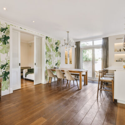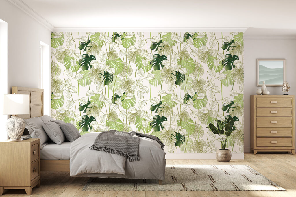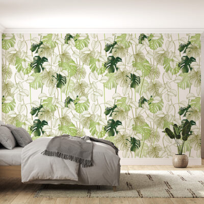 Ensuite, la palette de verts joue un rôle essentiel dans l’harmonie du décor. Les nuances oscillent entre vert tendre, vert sauge et vert profond, rehaussées par un fond clair qui illumine l’ensemble. Ce contraste subtil permet au motif de respirer et de s’adapter aussi bien aux petites qu’aux grandes surfaces murales. Le rendu reste lumineux, naturel et très élégant.