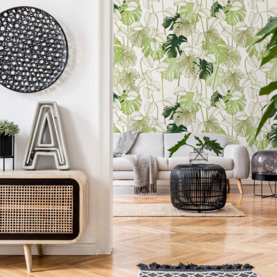 Tout d’abord, le motif met en scène un entrelacement de feuillages exotiques finement dessinés. Les feuilles de monstera, de philodendron et de plantes tropicales se superposent avec élégance, créant une composition dense mais parfaitement équilibrée. Les lignes délicates, parfois esquissées, parfois plus pleines, apportent de la profondeur et du mouvement au mur. Ainsi, ce papier peint feuillage exotique capte le regard sans jamais alourdir l’espace.