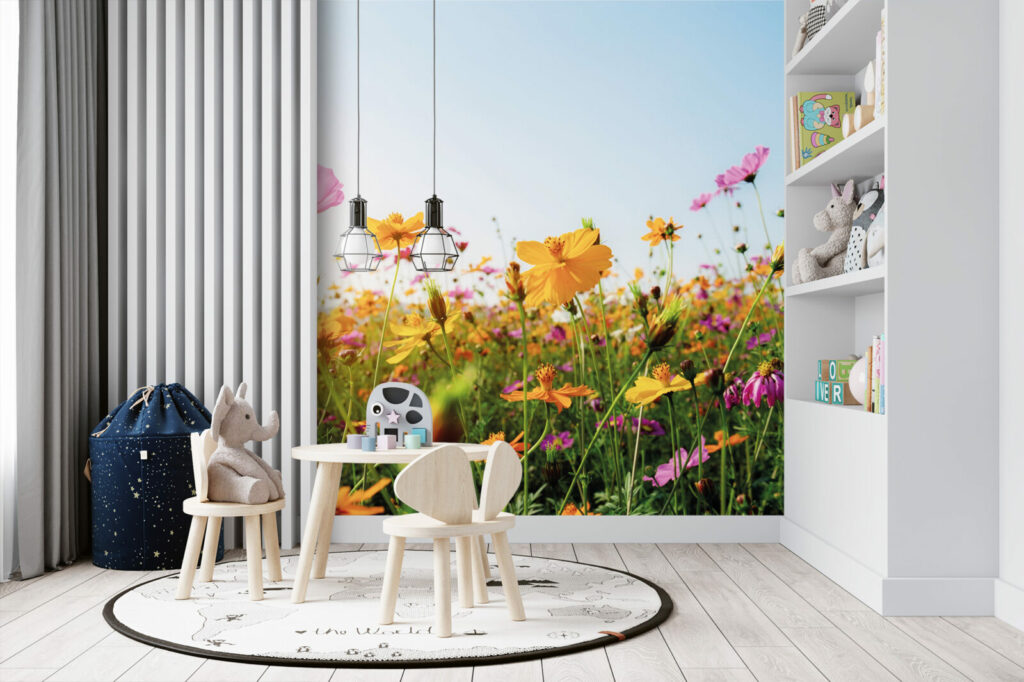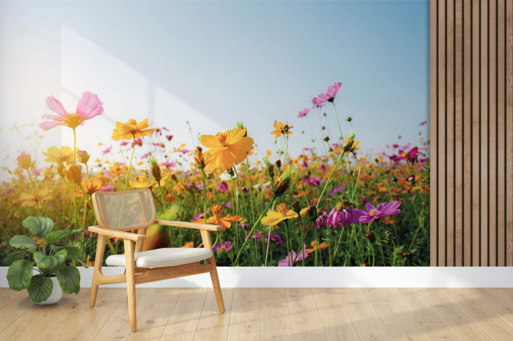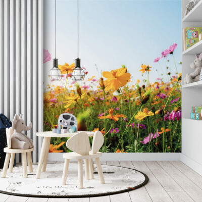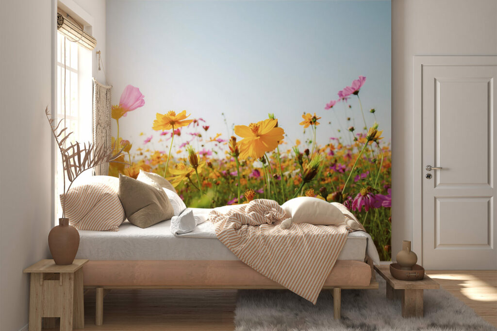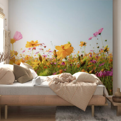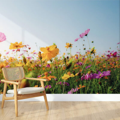Ce Papier peint fleur cosmos avec des fleurs des champs colorées des feuilles vertes sur un fond jaune est une décoration élégante grâce à laquelle votre chambre à coucher ou salon se transformera en intérieur raffiné. En effet, sur notre Papier peint fleur cosmos la précision de détails est garantie par nos machines les plus modernes et un impression en haute qualité. Grâce à la technologie innovante, notre papier peint moderne reflète parfaitement la profondeur des couleurs et met en relief la beauté des fleurs présentées.