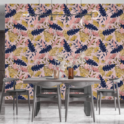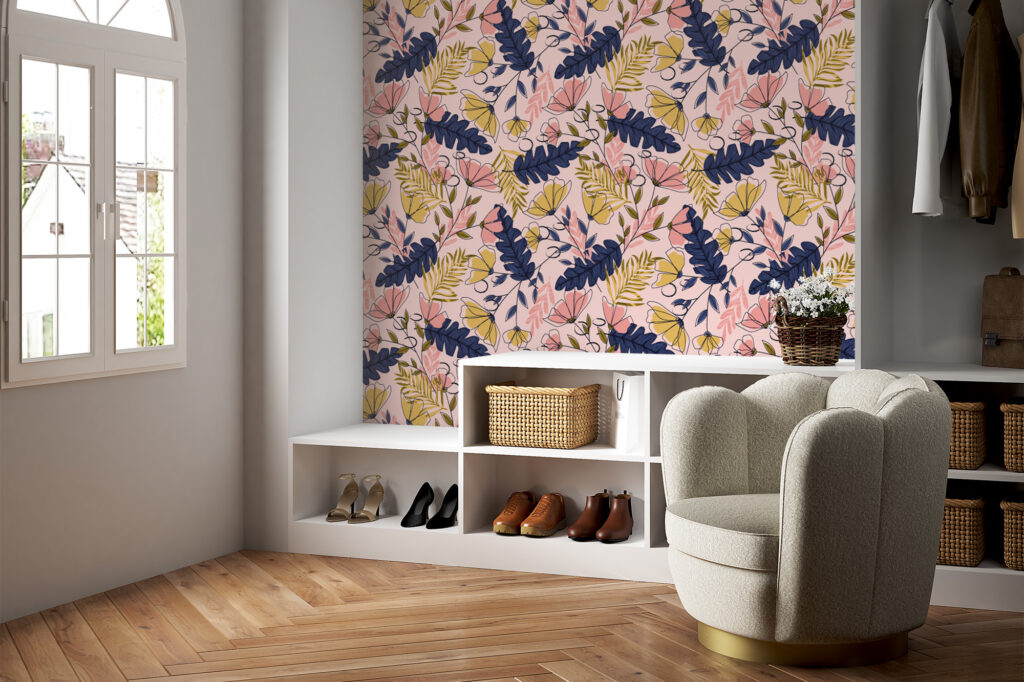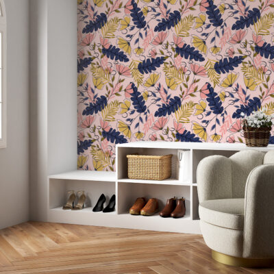 Tout d’abord, le design repose sur un dessin fin et expressif. Les fleurs et feuillages semblent esquissés à la main, avec des contours souples et aériens. Les pétales rose poudré dialoguent harmonieusement avec des feuillages bleu profond, tandis que des touches de jaune doux et de vert olive viennent rythmer l’ensemble. Cette palette équilibrée donne naissance à un papier peint fleuri rose bleu à la fois lumineux et apaisant.