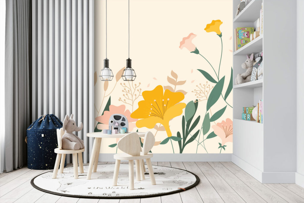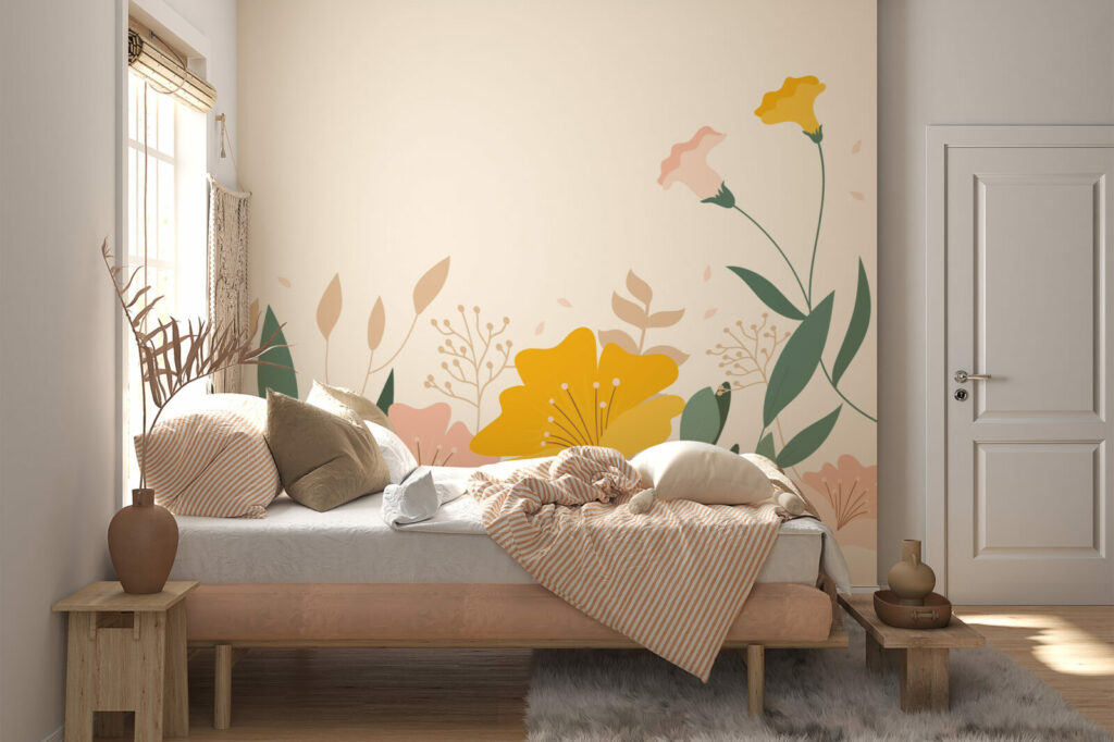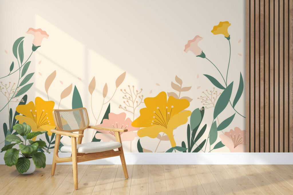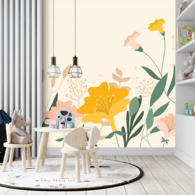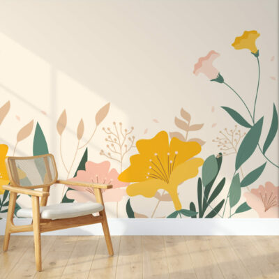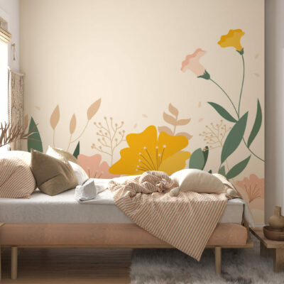 Ce Papier peint fleurs minimaliste avec des fleurs des champs colorées et des feuilles vertes sur fond jaune offre une décoration élégante, grâce à laquelle votre chambre ou votre salon se transformera en un intérieur sophistiqué.En effet, sur ce papier peint, la précision des détails est garantie par les machines les plus modernes et une haute qualité d’impression. Grâce à une technologie innovante, notre Papier peint fleurs moderne reflète parfaitement la profondeur des couleurs et met en valeur la beauté des fleurs exposées.