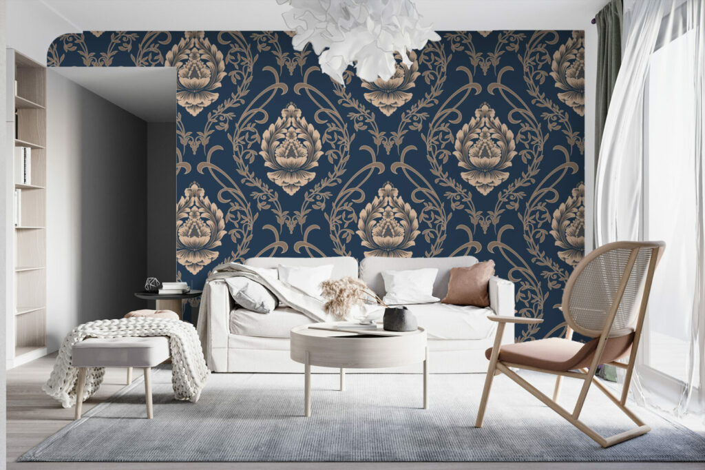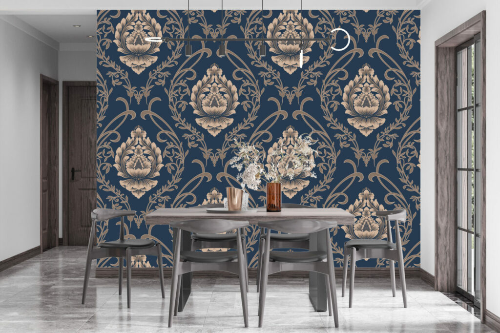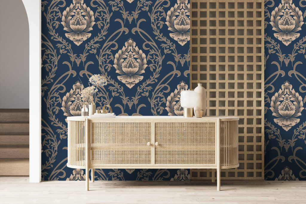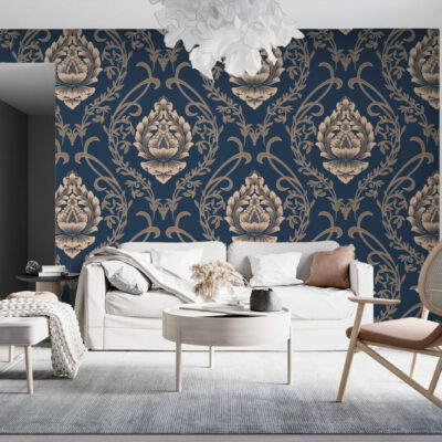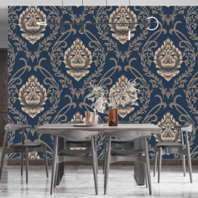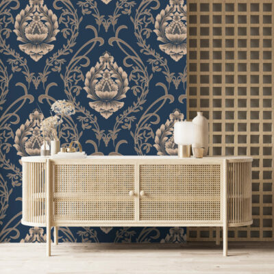 Le motif Damask Floral est idéal pour ceux qui recherchent une touche rétro et vintage dans leur décoration, tout en conservant une modernité subtile. Le contraste entre les nuances douces du beige rosé et l’arrière-plan bleu foncé met en valeur les détails décoratifs, créant un effet visuel à la fois audacieux et harmonieux. Ce papier peint s’intègre parfaitement dans un salon, une chambre ou un bureau, apportant une ambiance chic et raffinée.