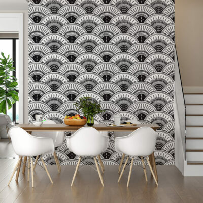 Le papier peint Half Mandala en noir et blanc présente un motif répétitif de demi-mandalas, créant un effet visuel captivant et élégant. Les mandalas, symboles de sérénité et d’équilibre, sont ici stylisés dans un design en éventail, chacun composé de détails géométriques fins et bien définis. Le contraste net entre le noir profond et le blanc pur apporte une touche à la fois moderne et intemporelle à ce motif, rendant ce papier peint adapté pour une large gamme de styles décoratifs.