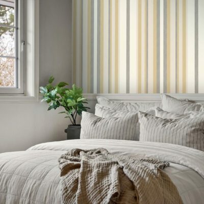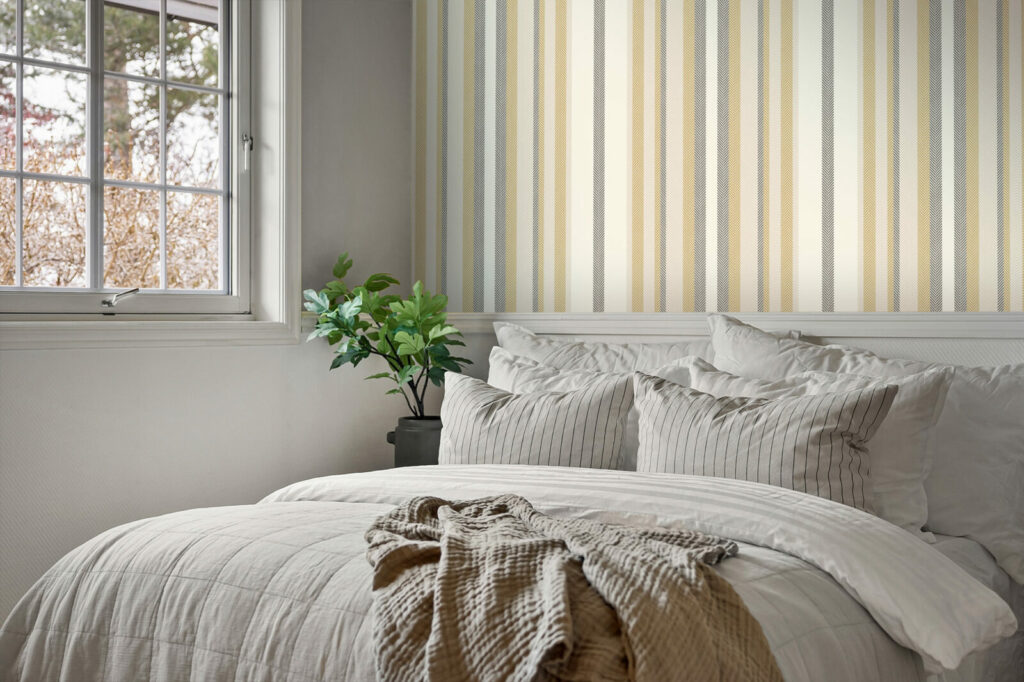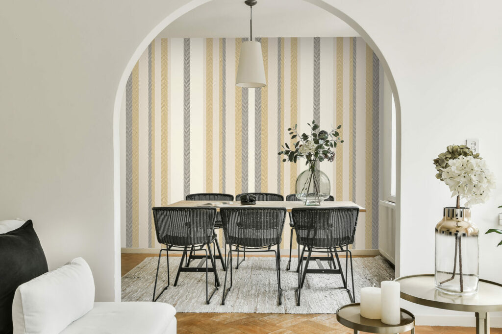 Le papier peint Herringbone élégant et intemporel présente un motif à rayures verticales subtilement orné de chevrons, créant une ambiance sophistiquée et raffinée. Les couleurs principales, un mélange de beige, doré et noir, se marient parfaitement pour offrir un design classique avec une touche contemporaine. Ce motif à rayures allongées est idéal pour donner l’illusion de hauteur à une pièce, tout en apportant de la structure et du dynamisme à votre espace intérieur.