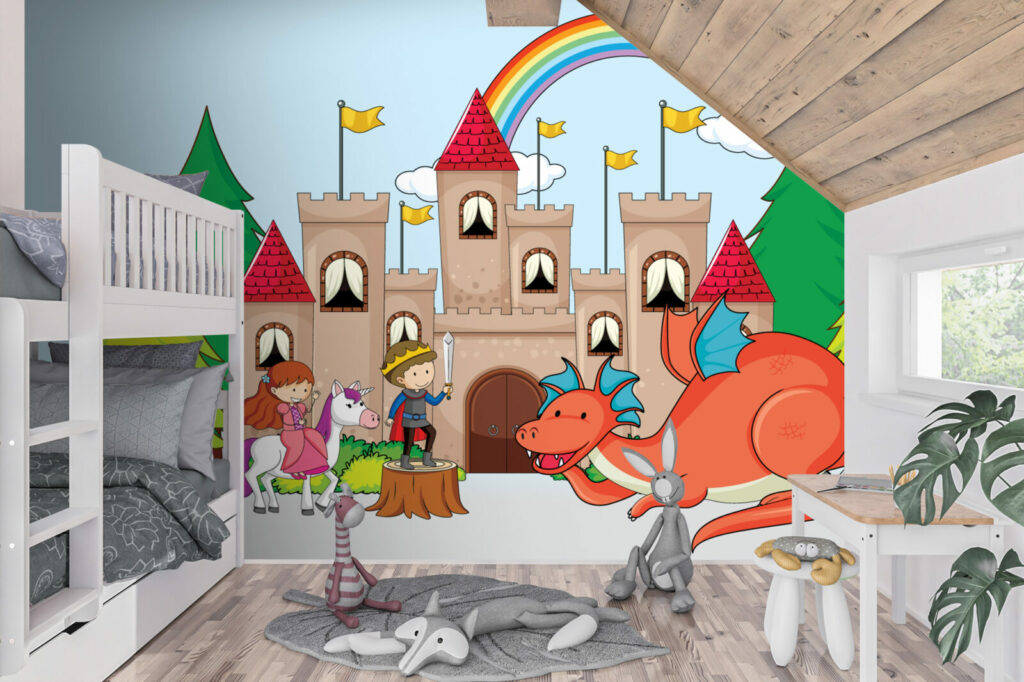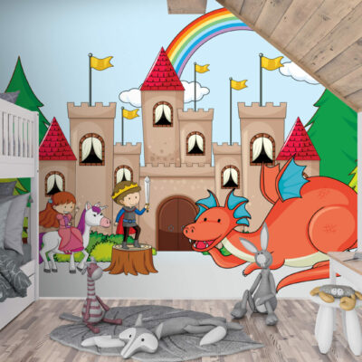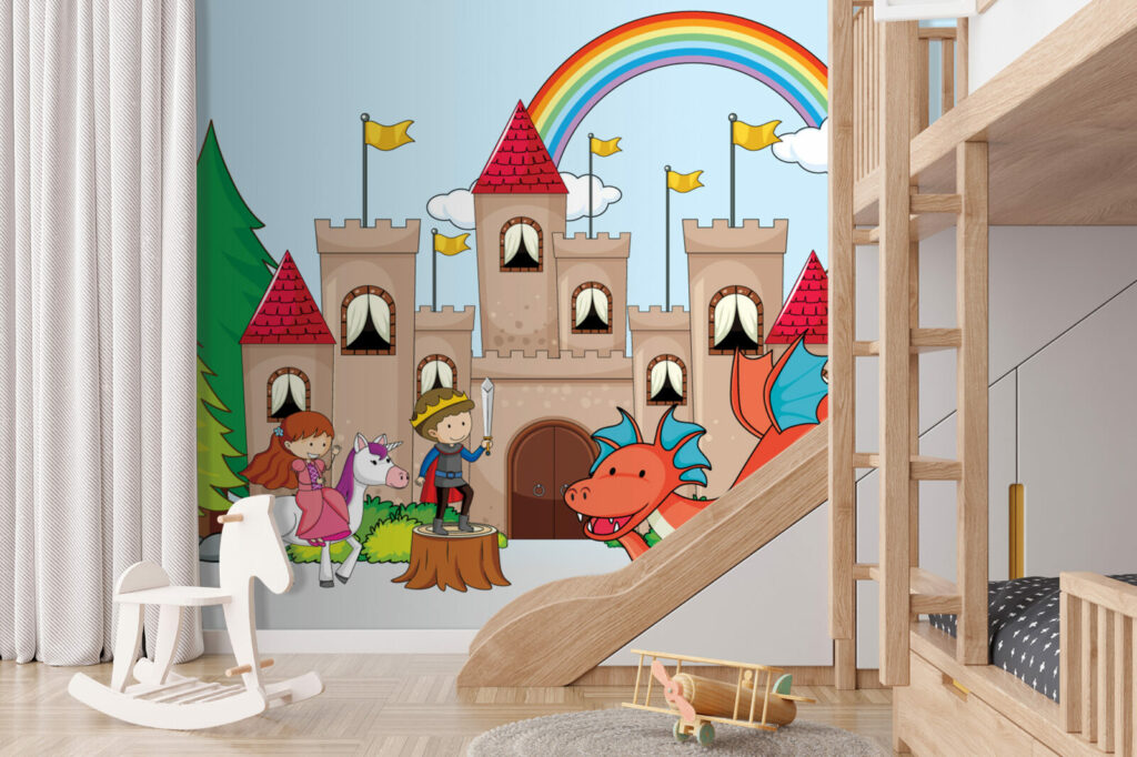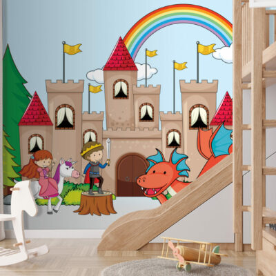 Les arbres verdoyants entourent la scène, ajoutant une touche de nature et de tranquillité, tandis que l’arc-en-ciel lumineux au-dessus du château symbolise la magie et l’espoir. Ce papier peint est idéal pour transformer un mur en scène de conte de fées, apportant une véritable atmosphère joyeuse et ludique.