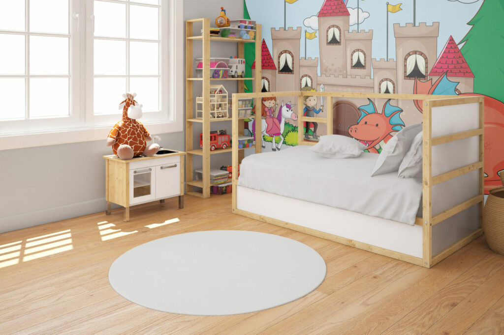 Le papier peint Imaginary Story, féerique et coloré est parfait pour créer un univers magique dans une chambre d’enfant ou une salle de jeux. Le design présente un château de conte de fées, un dragon amical, une princesse sur une licorne et un prince avec une épée, le tout sous un magnifique arc-en-ciel. Les couleurs vives et les illustrations détaillées font de ce papier peint un élément décoratif idéal pour stimuler l’imagination des plus petits.