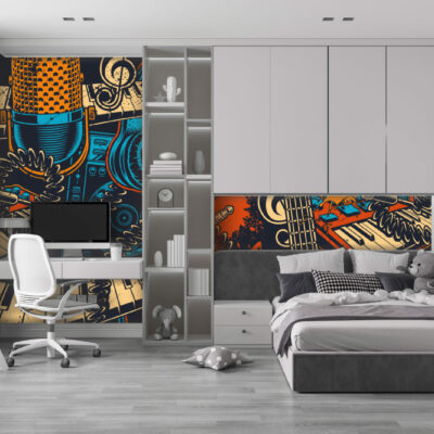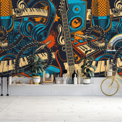 Le papier peint instruments Musique est le moyen idéal d’ajouter une touche d’expression rétro à votre salle à manger ou à votre cuisine ou même votre chambre. Son design et ses couleurs habilleront vos murs, il est parfait pour compléter tout décor existant. Créer une ambiance totalement rock attitude dans votre chambre sur le thème de la musique pour sortir du papier classique.