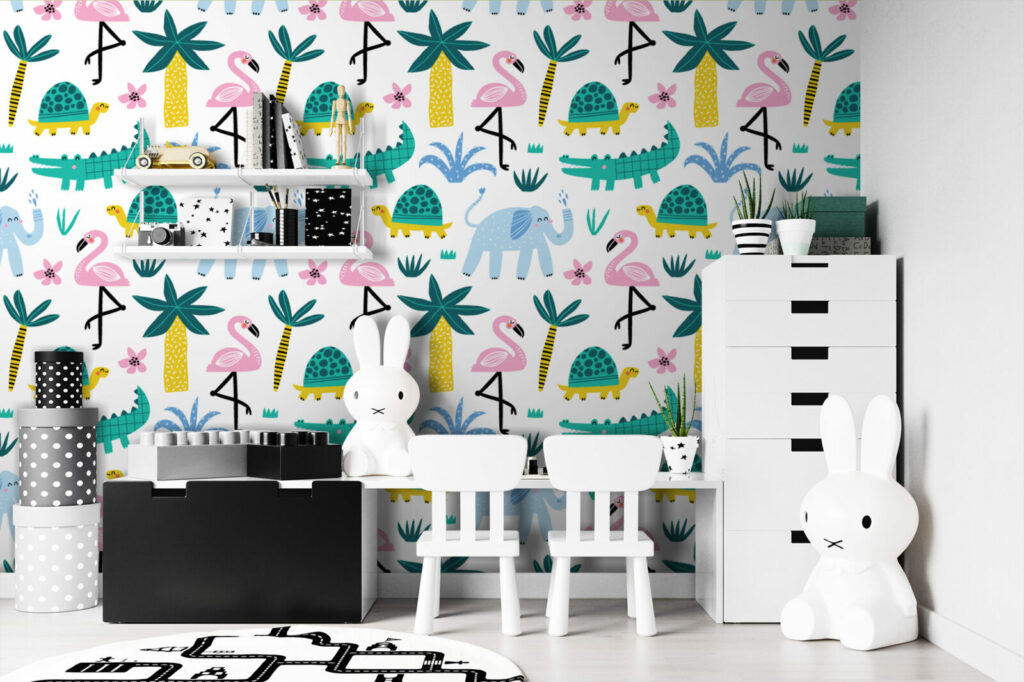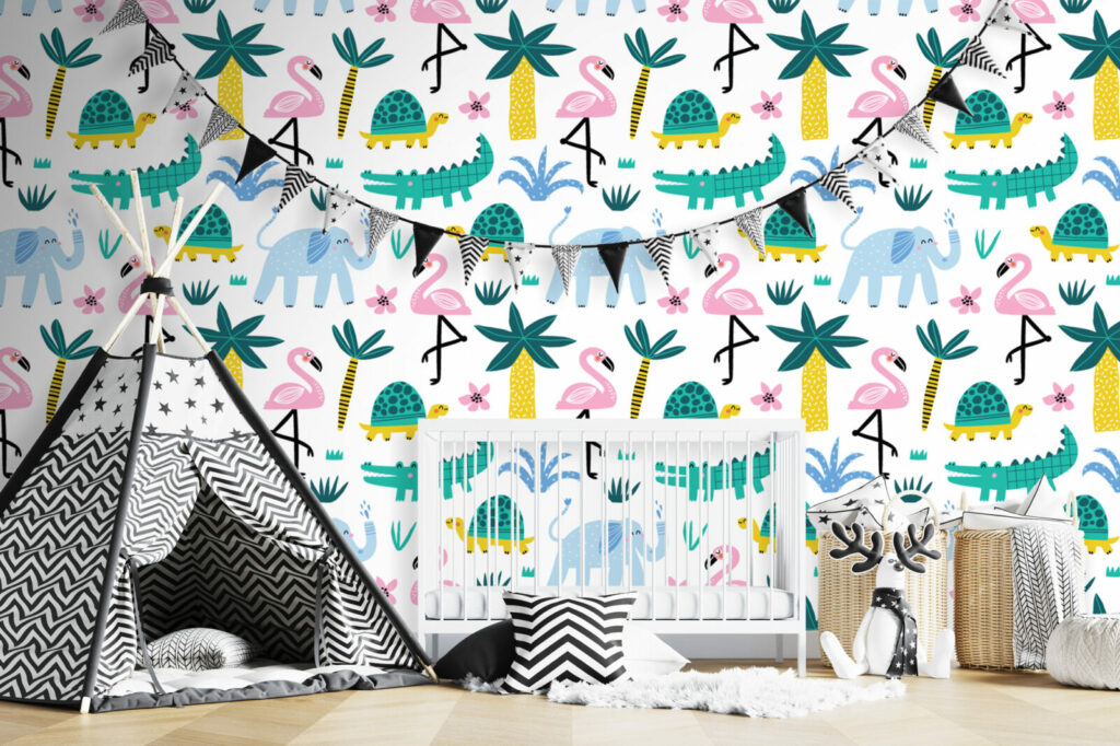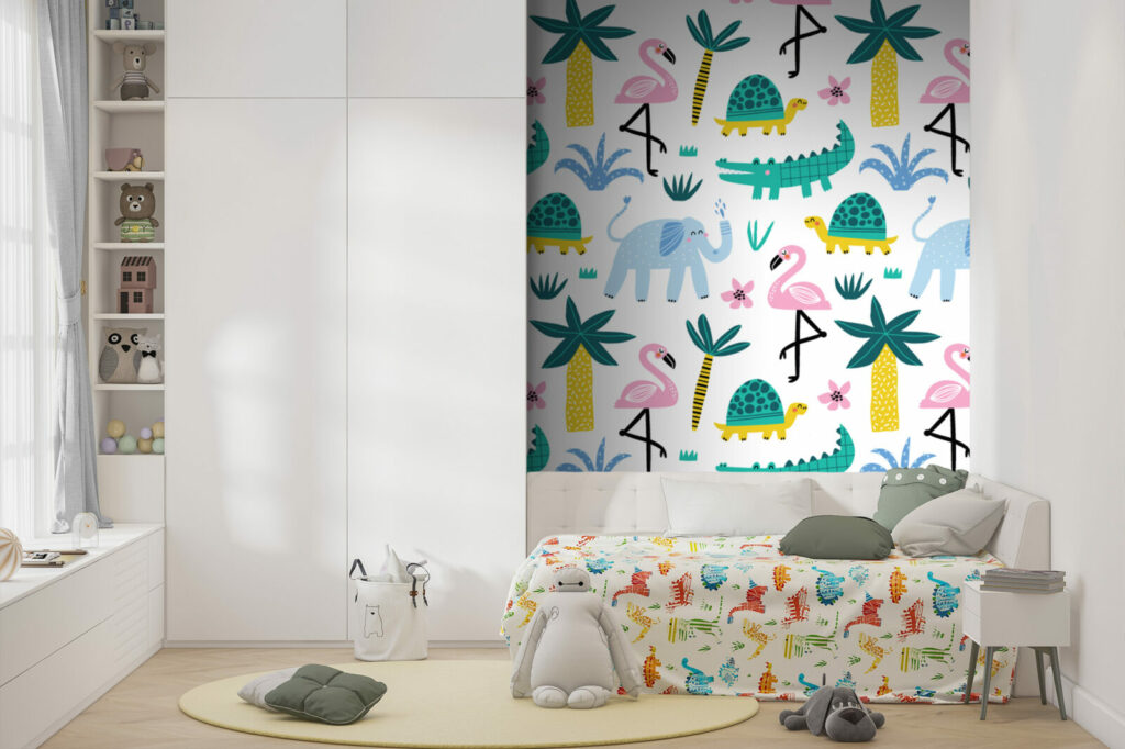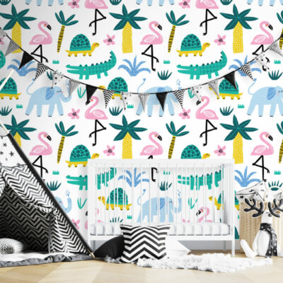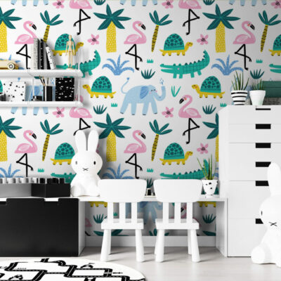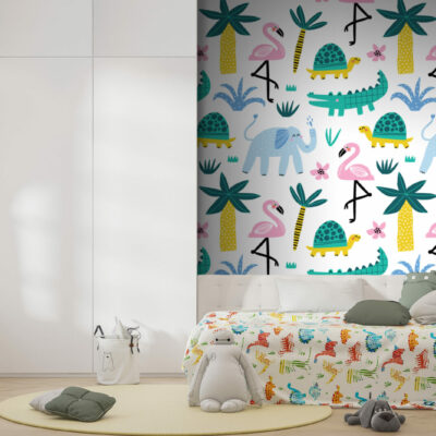 Ce papier peint Jungle Colorée vibrant et ludique est conçu pour égayer les chambres d’enfants et les espaces de jeux grâce à son motif inspiré de la jungle. Les illustrations colorées de divers animaux exotiques, tels que des éléphants, des tortues, des flamants roses et des crocodiles, créent un univers amusant et captivant qui stimule l’imagination. Les palmiers, fleurs et autres éléments végétaux, dessinés dans des tons vifs de vert, rose, bleu et jaune, ajoutent un aspect joyeux et dynamique.