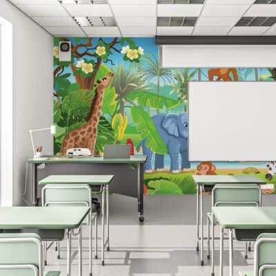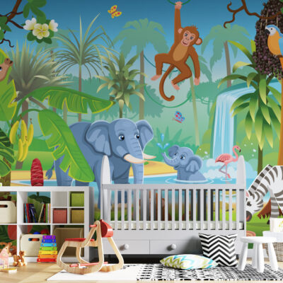 Jungle Party s’intègre facilement dans différents espaces dédiés aux enfants. Il habille un mur principal dans une chambre. Il structure aussi un coin lecture ou un espace de jeux. De plus, il convient parfaitement à une crèche, une salle d’attente ou une salle de jeux.