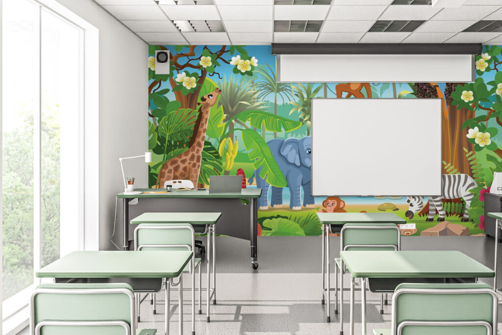 Papier peint jungle enfant ludique, coloré et plein de vie. Décor mural sur mesure, cadrage personnalisable et fabrication française.