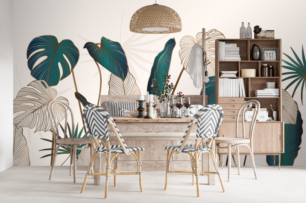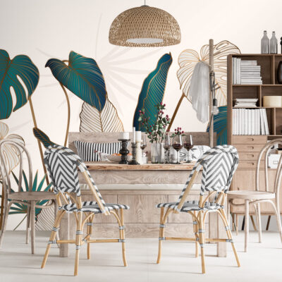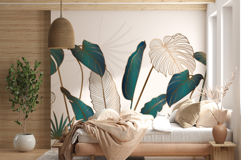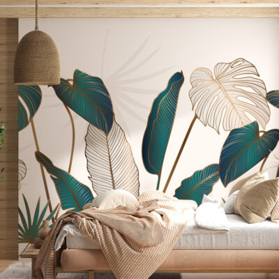Les feuilles alternent entre aplats colorés et tracés plus légers. Par conséquent, le regard circule naturellement sur le mur. Le décor gagne en profondeur sans devenir trop présent. Cette composition convient parfaitement aux intérieurs élégants, modernes ou inspirés du style hôtel chic.