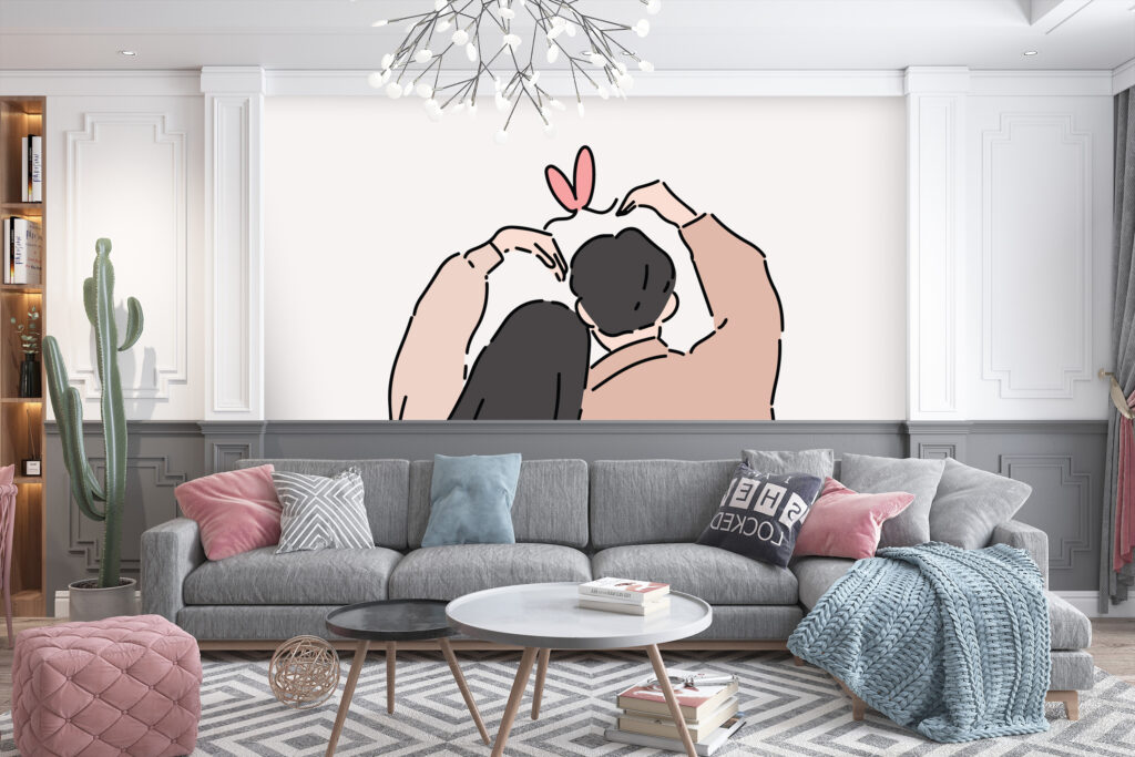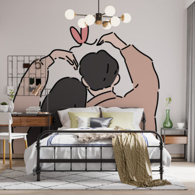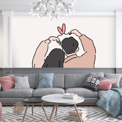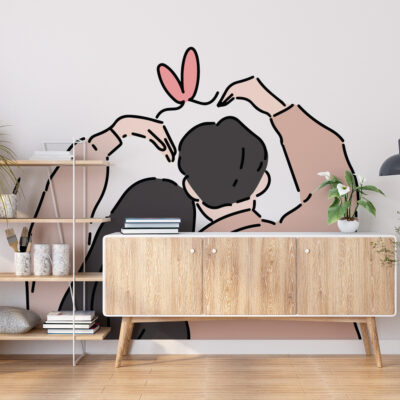 Le dessin minimaliste met en scène un couple vu de dos. Les lignes sont simples. Les couleurs sont douces. Le cœur formé par les bras devient un symbole universel d’amour et de connexion. Ainsi, ce papier peint Korean love parle autant aux adolescents qu’aux jeunes adultes sensibles à la culture K-drama, K-pop et aux univers romantiques coréens.
