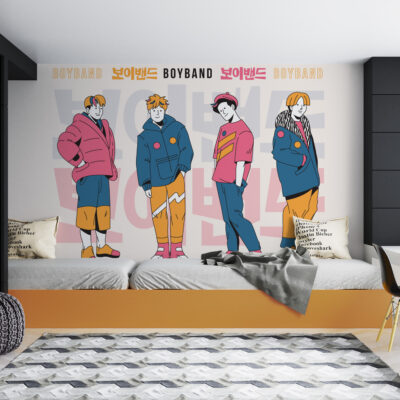 Grâce à son graphisme illustré, ce papier peint Kpop Idols met en scène un boyband stylisé, inspiré des codes visuels des idoles coréennes. Les silhouettes sont dynamiques. Les attitudes sont modernes. De plus, les couleurs pop – rose, bleu et jaune – créent une ambiance énergique sans être agressive. Ainsi, le décor accompagne le quotidien tout en restant agréable.