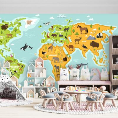 Apportez un peu plus de fun à la chambre de votre bébé avec le Papier peint mappemonde enfant « World Tour » ! Ce papier peint unique en son genre est le moyen idéal d’ajouter un peu de personnalité à la chambre de votre enfant. Sur le fond bleu des océans se détache les continents en vert et orange. Ce Papier peint mappemonde enfant « World Tour » présente une variété d’animaux adorables qui feront sourire votre bébé. Ce papier peint panoramique est le mur d’accent parfait pour tout parent soucieux du design et ne manquera pas de distinguer vos murs. Accrochez ce papier peint World tour dans la chambre de votre enfant pour une touche d’amusement et de créativité.