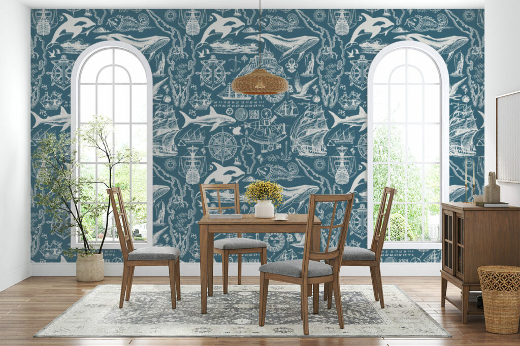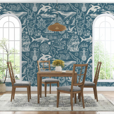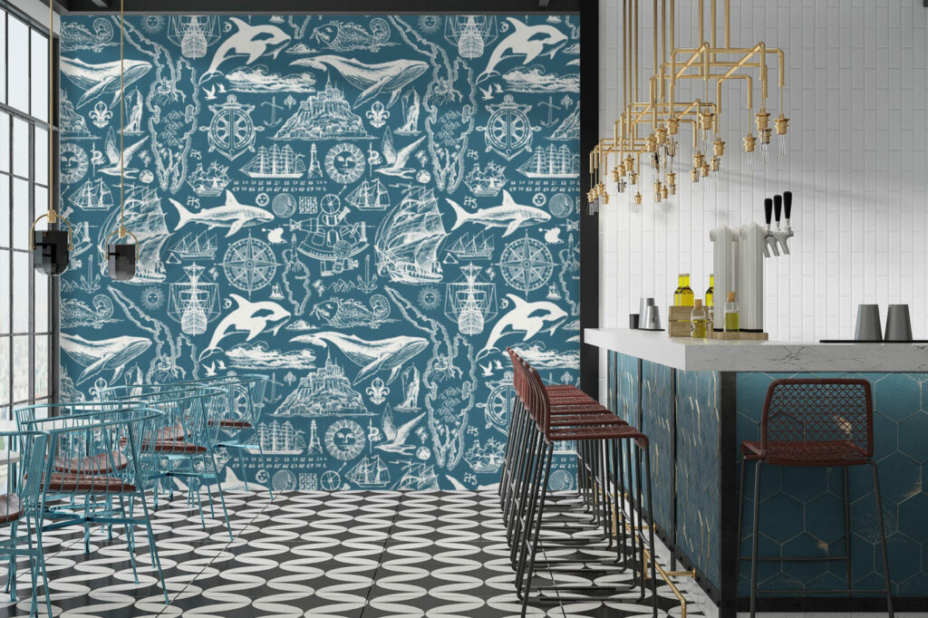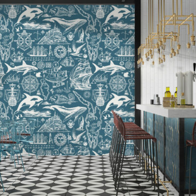 Créez une atmosphère nautique dans votre pièce avec le Papier peint Marin, un dessin délicat et gai à la fois. Sur un fond bleu se développent tout un tas de motifs sur le thèmes de la mer, un modèle parfait pour un bureau, un mur d’hôtel ou un restaurant au bord de la mer. Ce revêtement mural n’opprime pas les espaces, au contraire, il ajoute de la profondeur. Essayez ce Papier peint Marin avec des meubles blancs ou pastel pour créer un style frais et d’été.