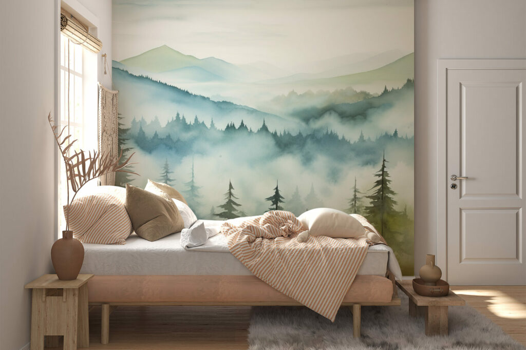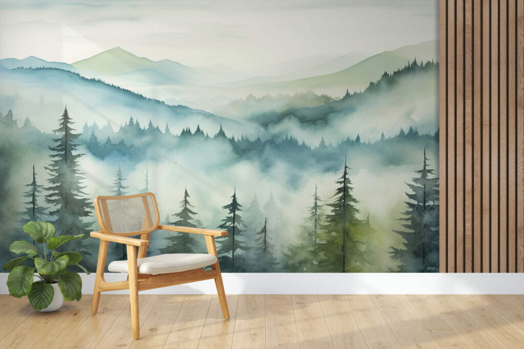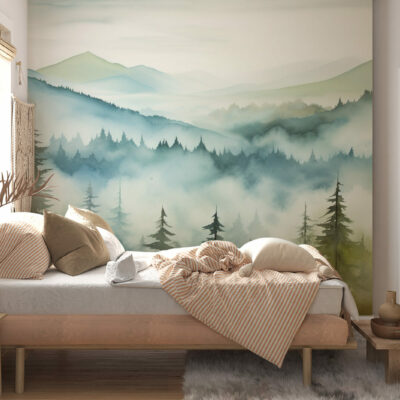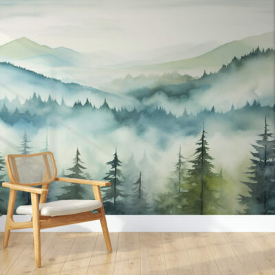 Diffusez dans votre intérieur le calme et le charme des arbres enveloppés de brume avec ce Papier Peint Foret brumeuse fait de montagnes et sapins vertigineux. Ce standard a été peint à la main et se caractérise par des tonalités de vert foncé, de blanc et de bleu, couleurs élégantes et profondes, parfaites pour introduire un thème naturel dans le salon, la salle de bains, la chambre ou autres pièces. Apportant la nature et le grand air sur vos murs, ce Papier peint montagnes sapins unique ajoutera une profondeur intense à l’espace et pourra être complété par un mobilier traditionnel ou scandinave, selon vos goûts. L’emploi de trois couleurs délicates rend ce papier peint suffisamment minimal pour qu’il s’adapte à toute une série d’espaces, où il créera une atmosphère reposante. Réalisez chez vous le parfait refuge pour vous relaxer avec ce Papier Peint foret brumeuse. Ce papier peint sur mesure a été conçu avec des techniques créatives d’aquarelle et, en les combinant avec un effet texturé du papier, ils ont créé un modèle plein de profondeur et de charme.