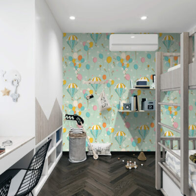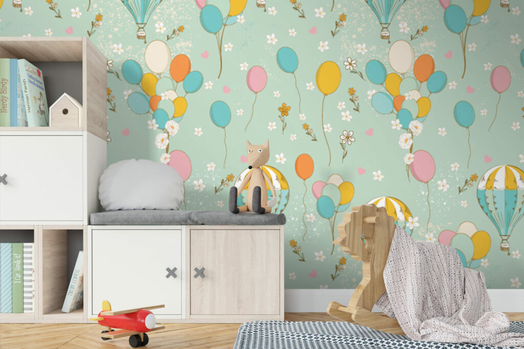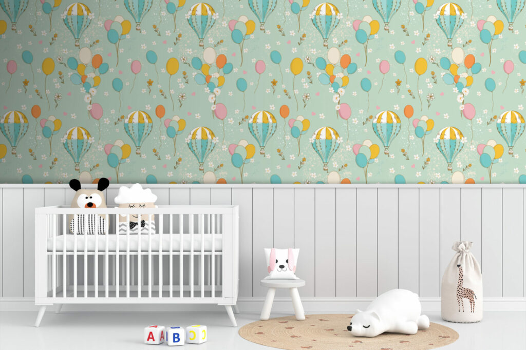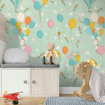 Transformez la chambre de votre enfant en un ciel enchanté avec notre papier peint montgolfières et ballons colorés. Ce design joyeux et ludique met en scène des montgolfières bleu, jaune et blanche qui flottent gracieusement aux côtés de ballons dans des teintes vives : bleu, rose, blanc, jaune et orange. Le tout est délicatement posé sur un fond vert clair, doux et apaisant, parsemé de petites fleurs blanches, apportant une touche de fraîcheur et de douceur à l’ensemble.