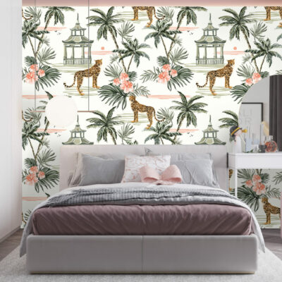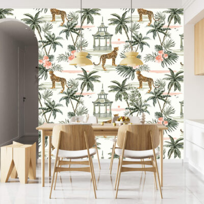 Ce papier peint motif guépard résonne comme un appel au voyage et à l’éveil. Les animaux exotiques se déplacent à travers une flore luxuriante et généreuse aux notes de vert vert et de rosé. Donner une touche jungle chic avec des imprimés de palmier et un ambiance féline pour les plus intrépides avec notre papier peint motif guépard.
