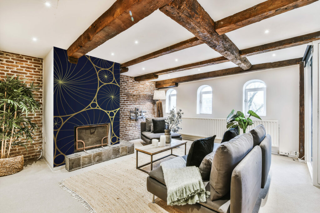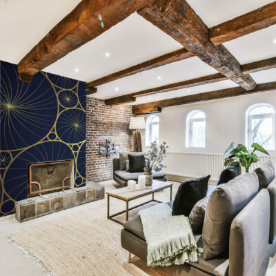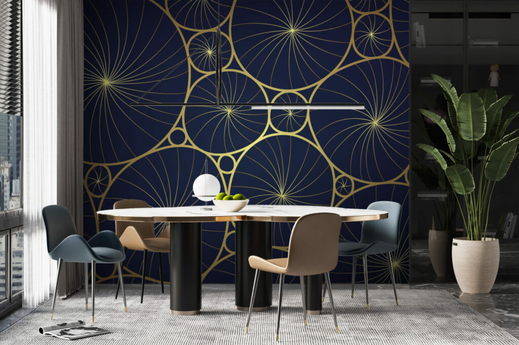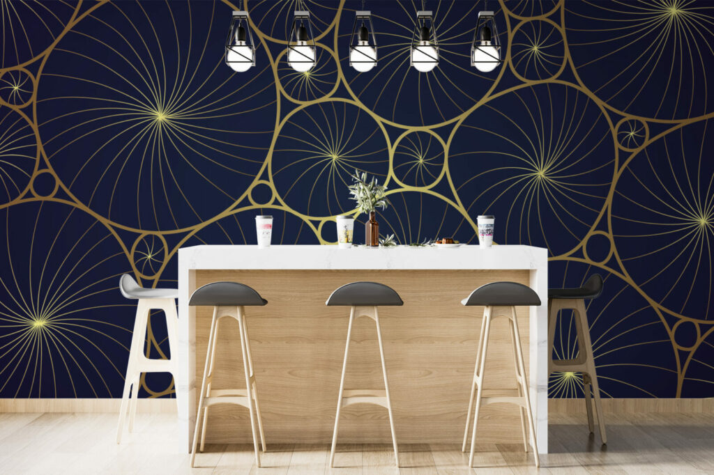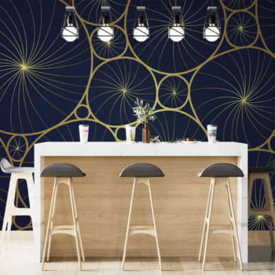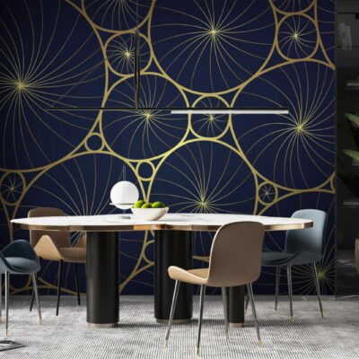 Découvrez notre papier peint Mumbai luxueux, idéal pour sublimer vos espaces intérieurs avec une touche de raffinement. Ce design sophistiqué, composé de motifs circulaires dorés entrelacés sur un fond sombre, apporte une ambiance élégante et moderne à tout type de pièce. Le mariage subtil entre l’or et le fond bleu nuit crée un contraste saisissant qui capte instantanément l’attention.
