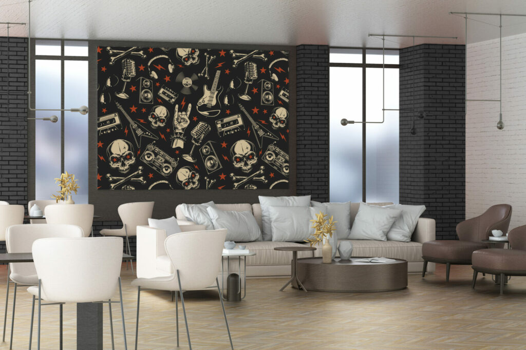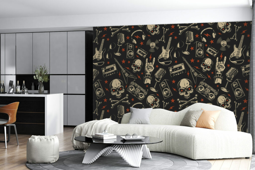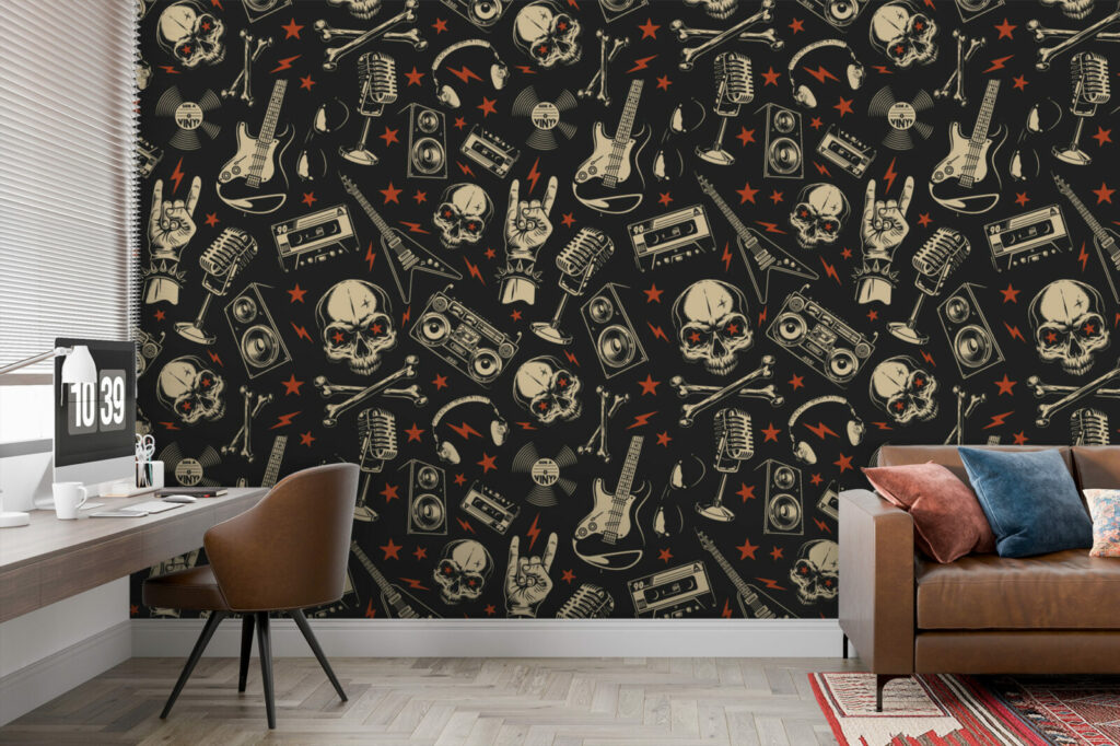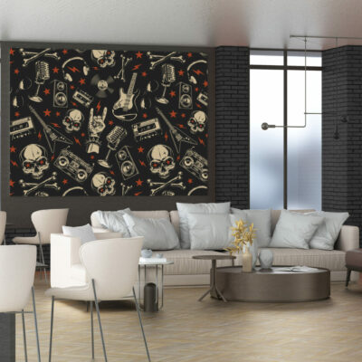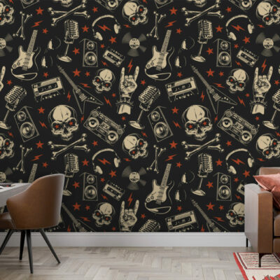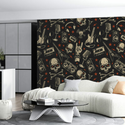 Ramenez le rock à la maison ! Pour une ambiance musicale qui sera réveiller votre espace de vie avec ce papier peint Musical Skull composé de guitares, de lunettes, d’enceintes, de cranes, d’étoiles, de micro, de cassettes, de magnétos . Disponible en vinyle adhésif repositionnable et en encollage mural.