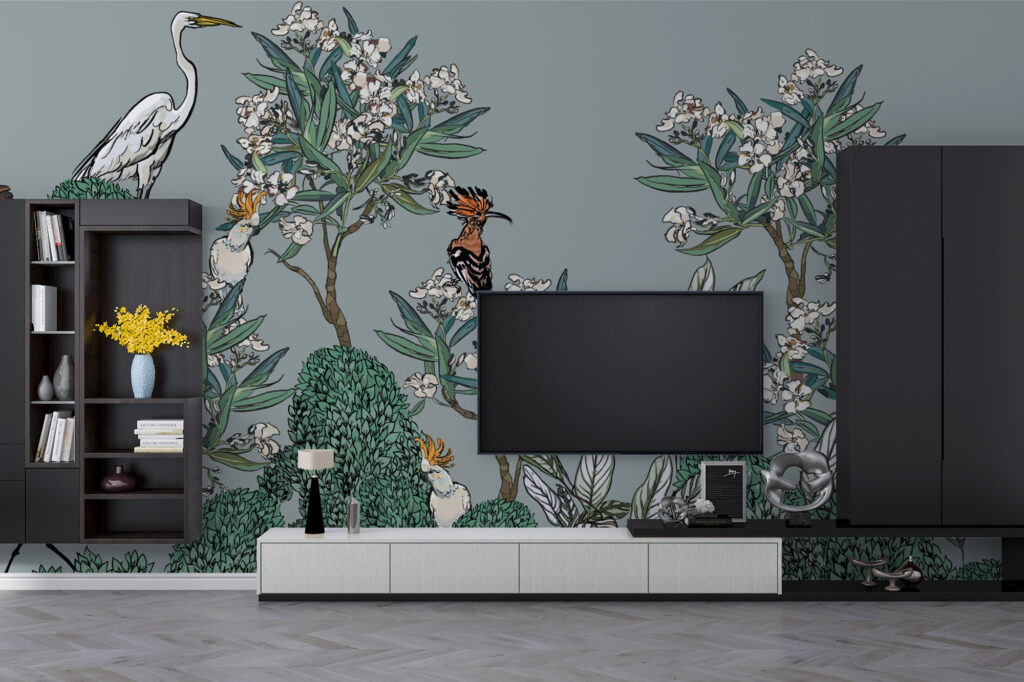 Ce papier peint oiseaux exotiques s’intègre facilement dans différentes pièces de la maison. Dans un salon, il devient un mur décoratif fort, capable de structurer l’espace sans l’écraser. Dans une chambre, il instaure une ambiance calme et dépaysante, propice à la détente. Il trouve également sa place dans un bureau, une salle à manger ou un espace d’accueil, où il crée une identité visuelle raffinée et chaleureuse.