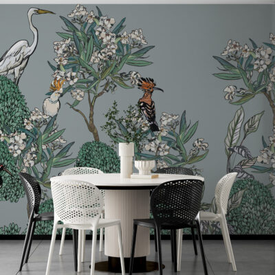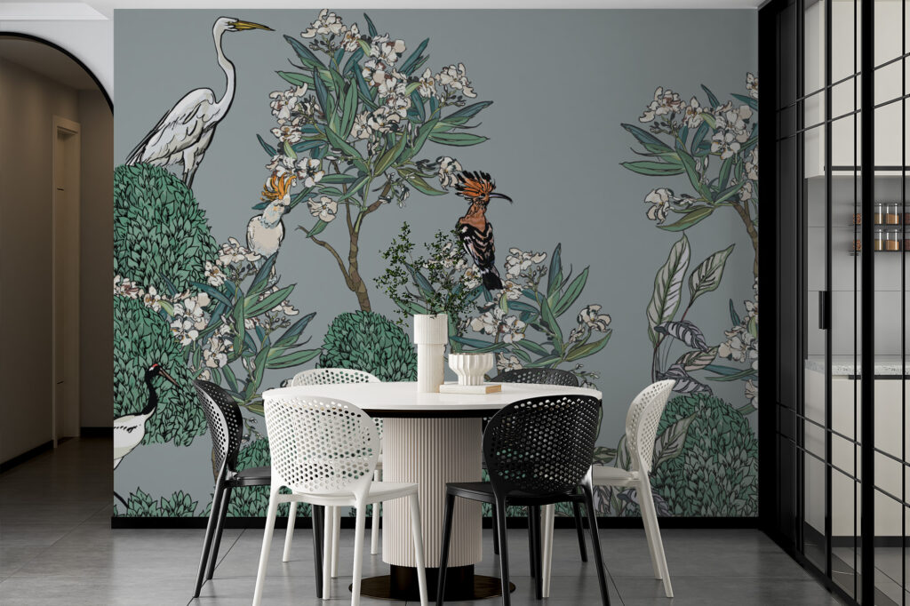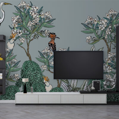 Ensuite, les oiseaux occupent une place centrale dans la composition. Grues, hérons, cacatoès et autres oiseaux exotiques se posent avec élégance au cœur du paysage. Chaque espèce est illustrée avec finesse, révélant la richesse des plumages et la diversité des silhouettes. Ces présences animales insufflent une dynamique douce au décor et renforcent l’impression d’évasion naturelle.