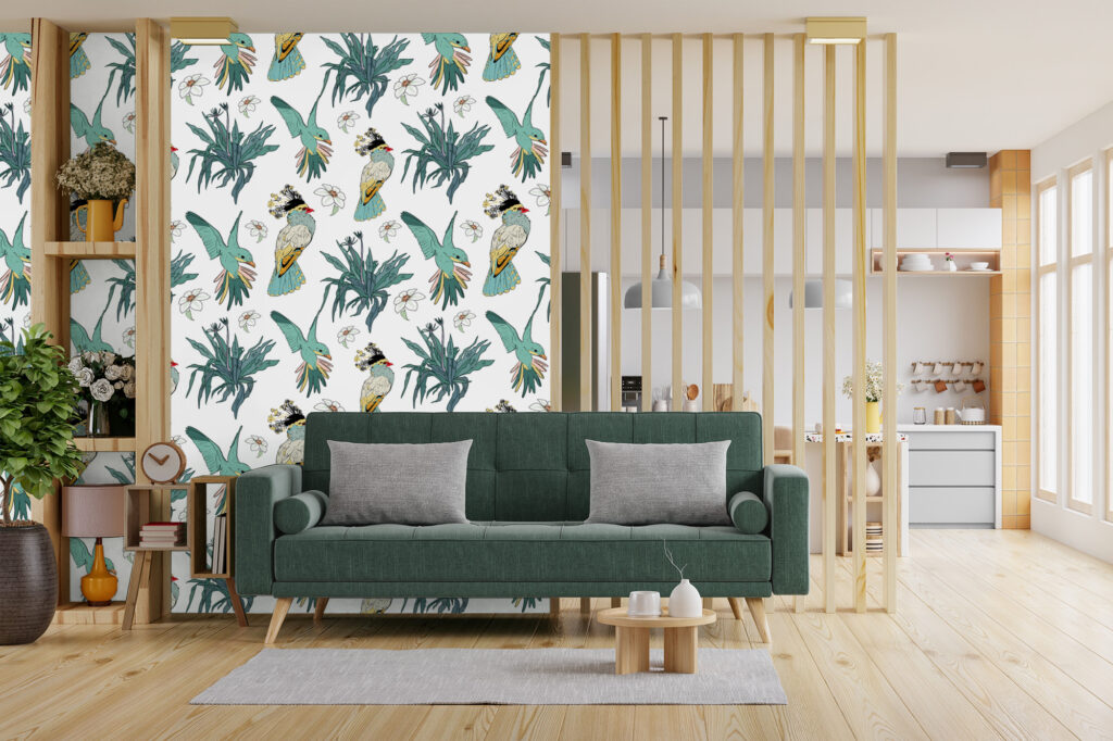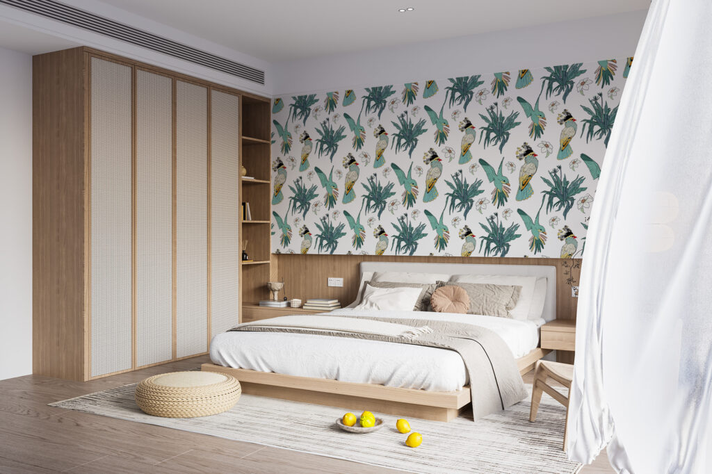 Ensuite, le fond clair du motif joue un rôle essentiel. Il met en valeur les illustrations tout en conservant une grande luminosité dans la pièce. Ainsi, ce papier peint oiseaux tropicaux apporte du caractère sans assombrir l’espace. Il convient parfaitement aux pièces de vie comme le salon ou la salle à manger, mais aussi à une chambre ou à un bureau en quête d’évasion.
