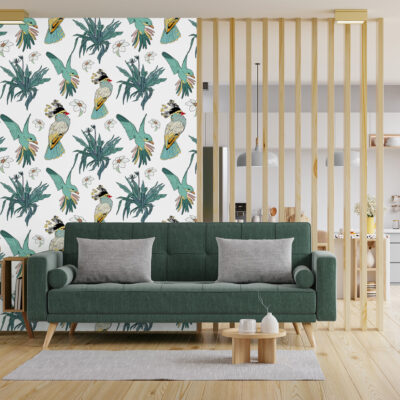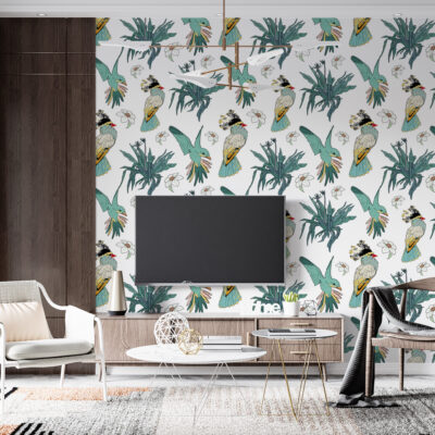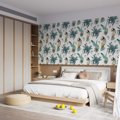 Grâce à son motif répétitif, ce papier peint oiseaux tropicaux offre une grande liberté d’aménagement. Il peut habiller un mur entier, souligner un espace précis ou structurer une zone comme un coin salon ou une tête de lit. Le dessin reste lisible et élégant, même sur de grandes surfaces, ce qui garantit un rendu cohérent et esthétique.