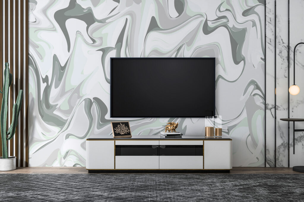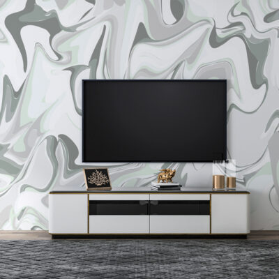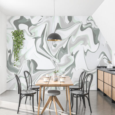 Tout d’abord, le design repose sur un jeu de formes ondulantes et de lignes fondues, inspirées des effets de matière et de marbrure. Les courbes se déploient librement, créant une impression de mouvement continu. Chaque zone du motif semble glisser naturellement vers la suivante, ce qui confère au papier peint panoramique abstrait une sensation de fluidité et de profondeur.