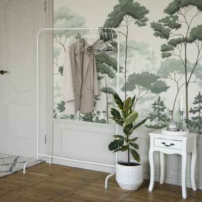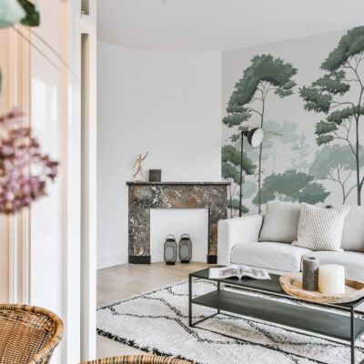 Tout d’abord, le design joue sur la superposition des silhouettes d’arbres. Les troncs élancés se dessinent avec finesse tandis que les feuillages se fondent progressivement dans un arrière-plan brumeux. Cette composition crée un véritable effet de profondeur. Ainsi, le mur semble s’ouvrir et gagner en perspective, ce qui agrandit visuellement l’espace. Les nuances de vert sauge, de vert grisé et de vert mousse renforcent cette impression de calme et de légèreté.