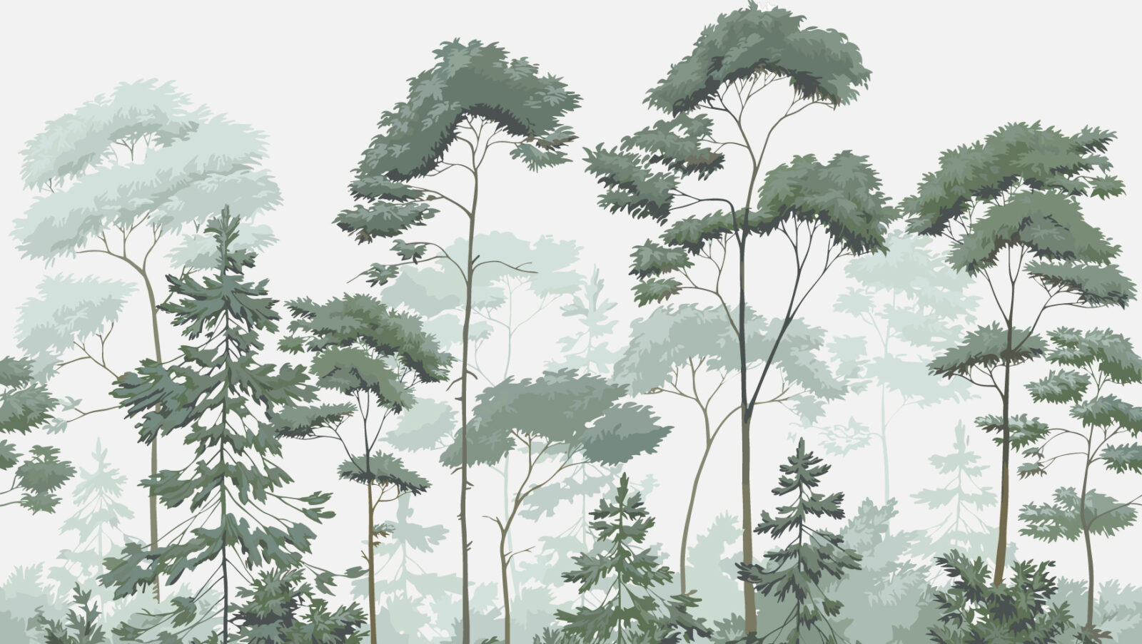 Tout d’abord, le design joue sur la superposition des silhouettes d’arbres. Les troncs élancés se dessinent avec finesse tandis que les feuillages se fondent progressivement dans un arrière-plan brumeux. Cette composition crée un véritable effet de profondeur. Ainsi, le mur semble s’ouvrir et gagner en perspective, ce qui agrandit visuellement l’espace. Les nuances de vert sauge, de vert grisé et de vert mousse renforcent cette impression de calme et de légèreté.