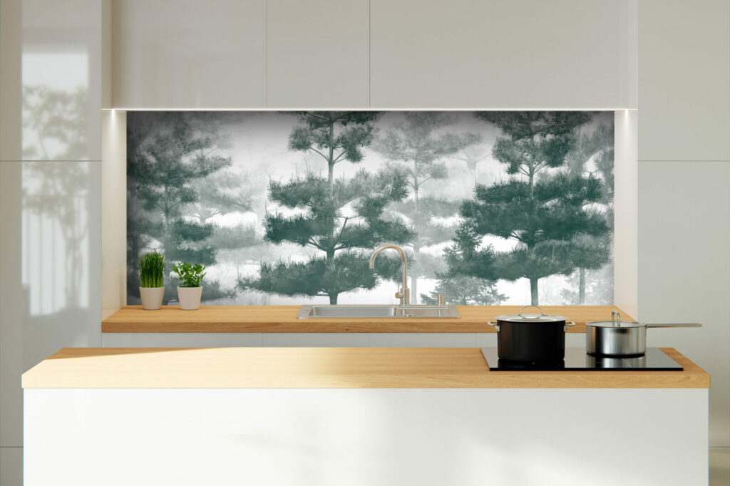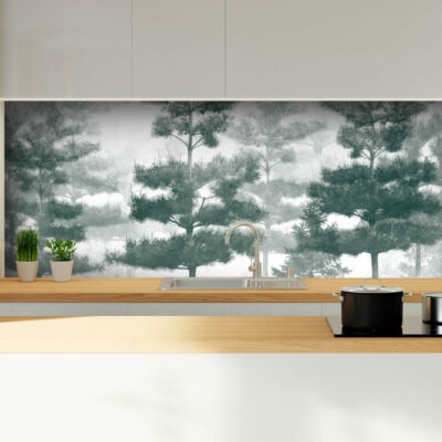 L’illustration d’une forêt grandeur nature donnera à ce papier peint un aspect naturel dans n’importe quel espace. Les tons sombres des arbres se mélangent à la brume, donnant de la profondeur et de la texture à l’ensemble de l’objet.