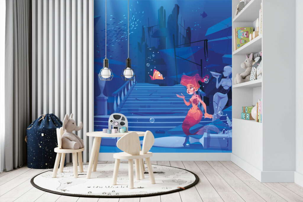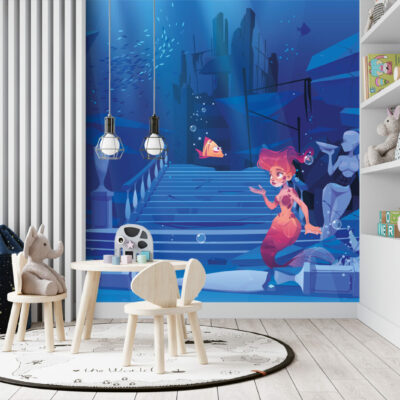 Laissez-vous captiver par la merveilleuse ambiance de ce Papier peint panoramique Sirène. Ce modèle présente une magnifique sirène et un poisson ressemblant à des dessins animés, qui seront parfaits pour décorer avec style la chambre de votre enfant. Le panorama représente des statues gracieuses et une sirène colorée dans une palette pastel allant du bleu lagon au rose corail. Placez ces motifs sur autant de murs que vous le souhaitez dans la chambre de votre enfant ou dans la chambre de vos enfants pour créer un intérieur magique. Combinez le motif de la Petite Sirène avec un décor pastel et d’autres éléments sur le thème de l’océan pour un look final à la fois amusant et tendance.