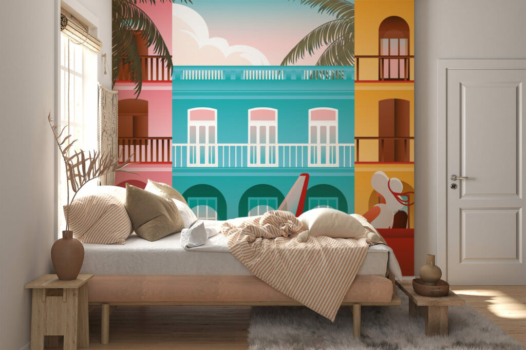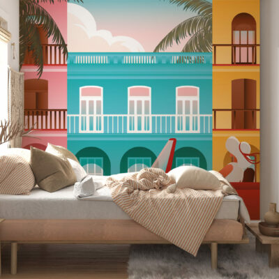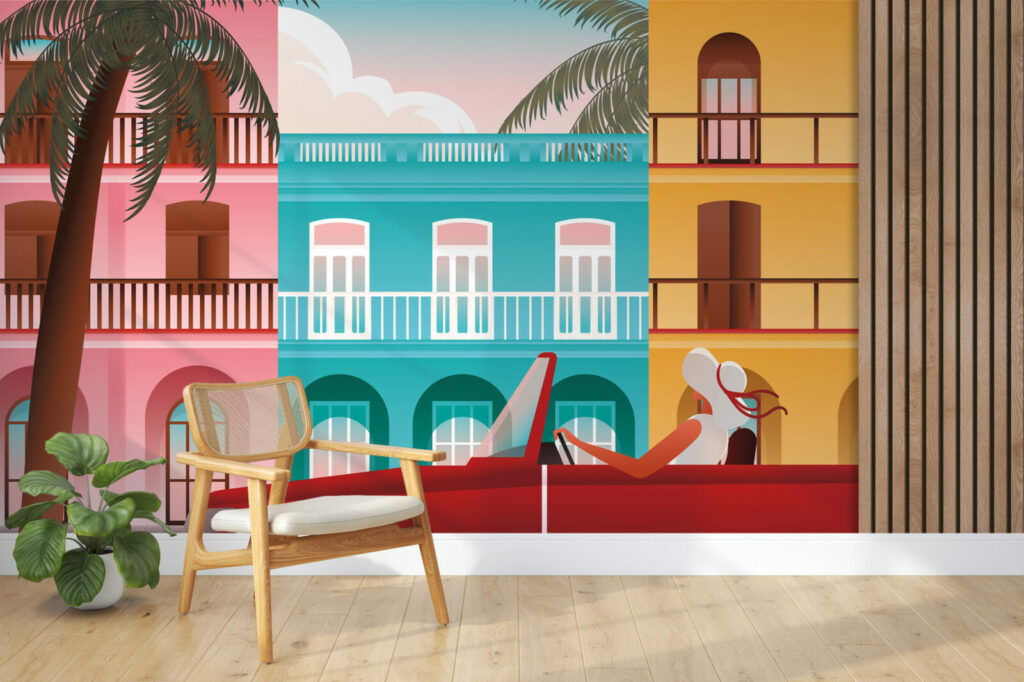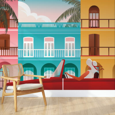 Laissez vous porter par cette illustration murale dans la rue à La Havane avec des maisons colorées à l’arrière-plan. Imaginez-vous à Cuba avec ce joli papier peint ville et voyagez au bout du monde.